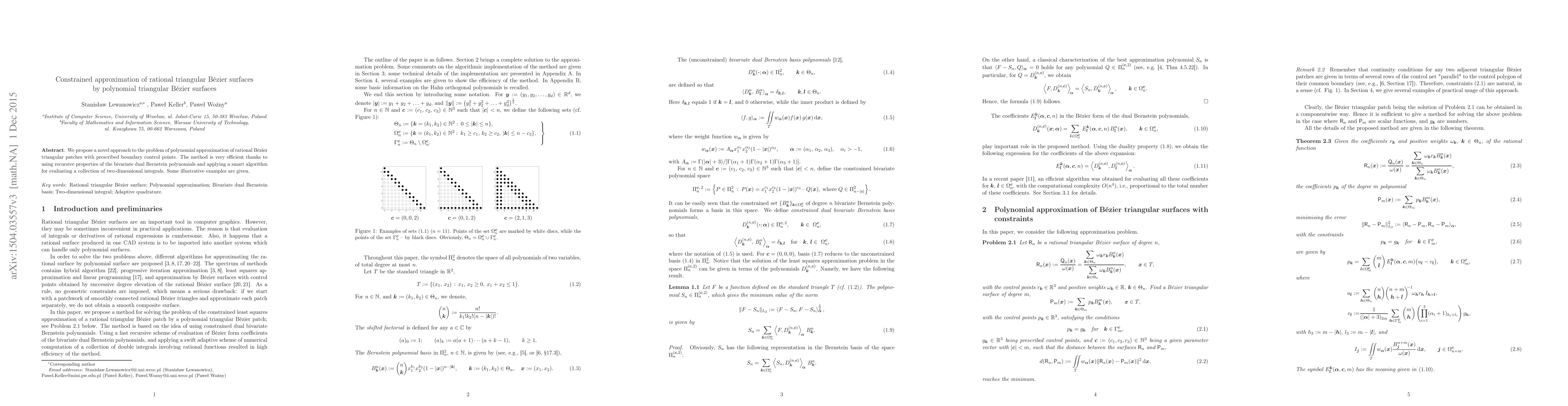 We propose a novel approach to the problem of polynomial approximation of rational B\'ezier triangular patches with prescribed boundary control points. The method is very efficient thanks to using recursive properties of the bivariate dual Bernstein polynomials and applying a smart algorithm for evaluating a collection of two-dimensional integrals. Some illustrative examples are given.