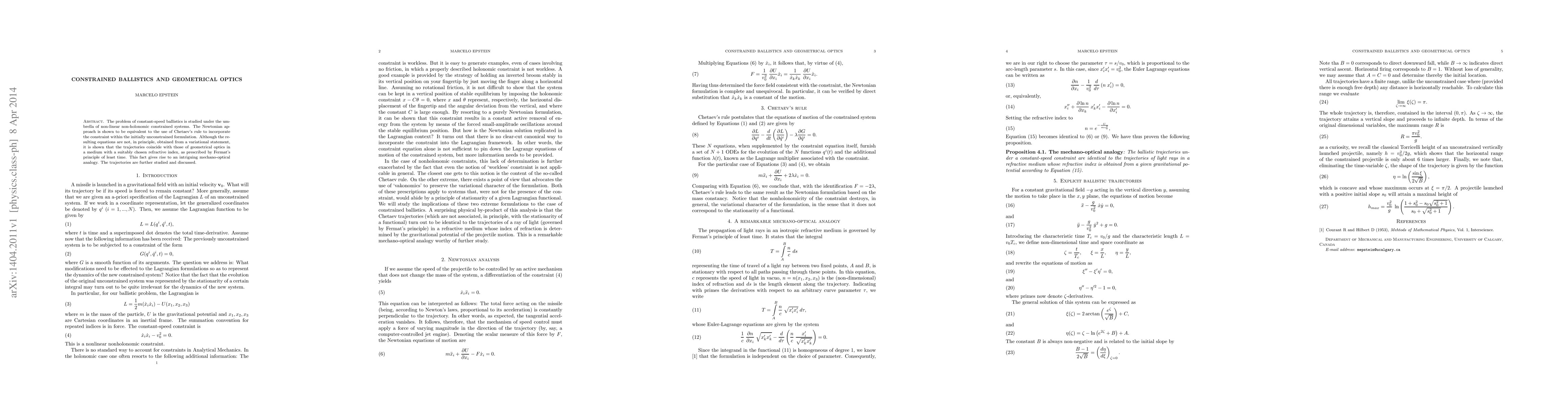 The problem of constant-speed ballistics is studied under the umbrella of non-linear non-holonomic constrained systems. The Newtonian approach is shown to be equivalent to the use of Chetaev's rule to incorporate the constraint within the initially unconstrained formulation. Although the resulting equations are not, in principle, obtained from a variational statement, it is shown that the trajectories coincide with those of geometrical optics in a medium with a suitably chosen refractive index, as prescribed by Fermat's principle of least time. This fact gives rise to an intriguing mechano-optical analogy. The trajectories are further studied and discussed.