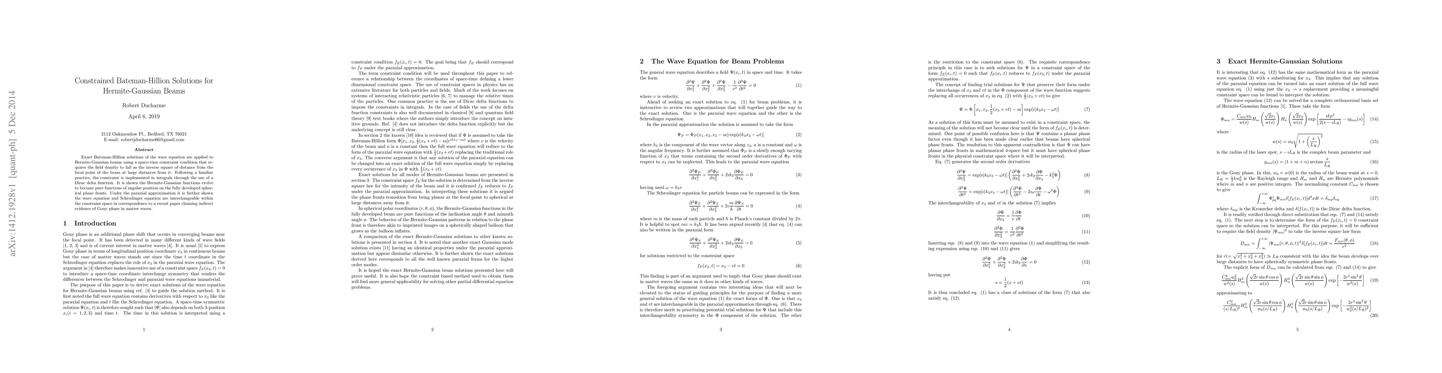 Exact Bateman-Hillion solutions of the wave equation are applied to Hermite-Gaussian beams using a space-time constraint condition that requires the field density to fall as the inverse square of distance from the focal point of the beam at large distances from it. Following a familiar practice, the constraint is implemented in integrals through the use of a Dirac delta function. It is shown the Hermite-Gaussian functions evolve to become pure functions of angular position on the fully developed spherical phase fronts. Under the paraxial approximation it is further shown the wave equation and Schrodinger equation are interchangeable within the constraint space in correspondence to a recent paper claiming indirect evidence of Gouy phase in matter waves.