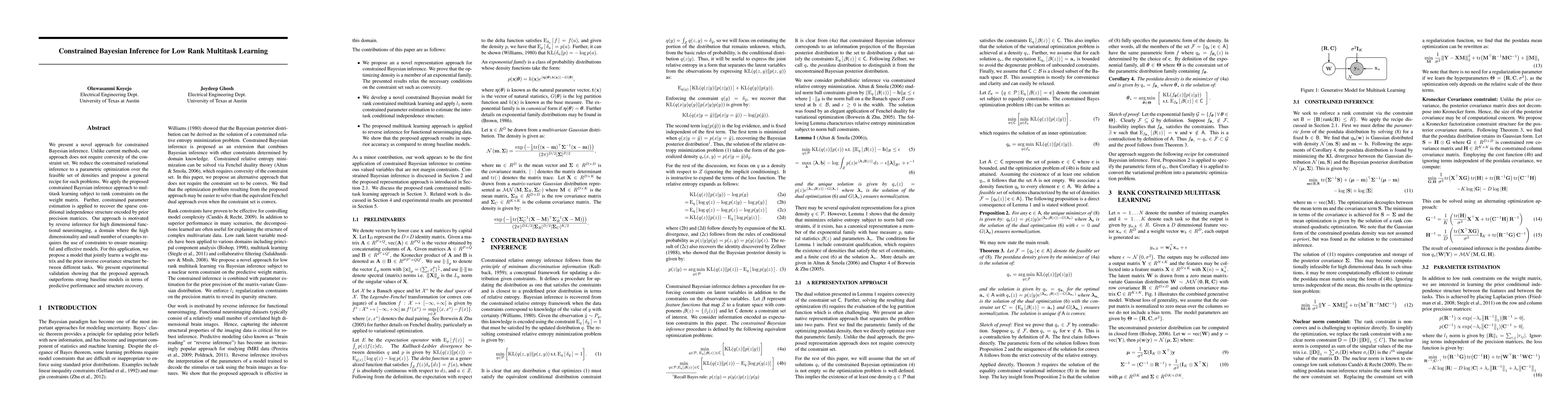 We present a novel approach for constrained Bayesian inference. Unlike current methods, our approach does not require convexity of the constraint set. We reduce the constrained variational inference to a parametric optimization over the feasible set of densities and propose a general recipe for such problems. We apply the proposed constrained Bayesian inference approach to multitask learning subject to rank constraints on the weight matrix. Further, constrained parameter estimation is applied to recover the sparse conditional independence structure encoded by prior precision matrices. Our approach is motivated by reverse inference for high dimensional functional neuroimaging, a domain where the high dimensionality and small number of examples requires the use of constraints to ensure meaningful and effective models. For this application, we propose a model that jointly learns a weight matrix and the prior inverse covariance structure between different tasks. We present experimental validation showing that the proposed approach outperforms strong baseline models in terms of predictive performance and structure recovery.
