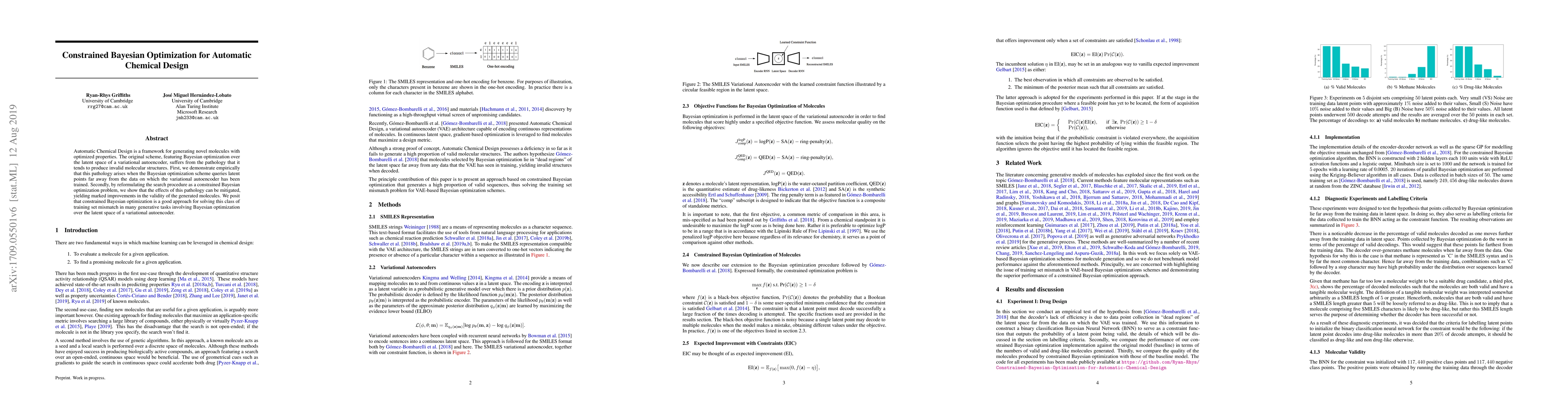 This paper addresses the issue of invalid molecular structures in automatic chemical design using Bayesian optimization. It reformulates the search as a constrained optimization problem to mitigate the pathology of generating invalid molecules, leading to more valid structures.