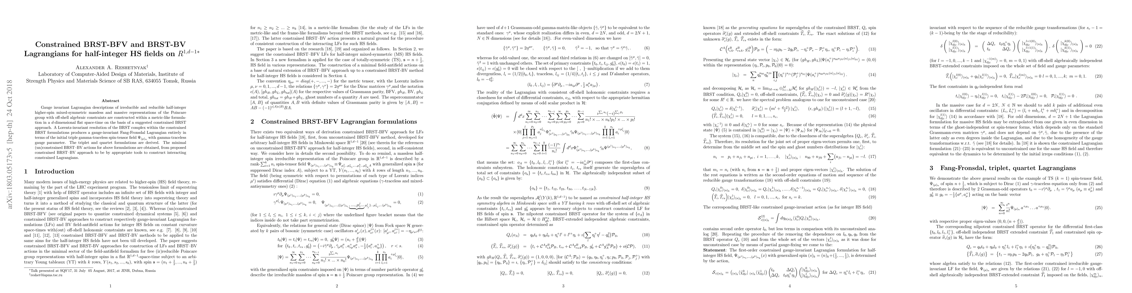 This paper constructs gauge invariant Lagrangians for half-integer higher-spin fields using a constrained BRST approach in a $d$-dimensional flat space-time. It derives Lorentz-invariant BRST formulations leading to Fang-Fronsdal Lagrangians, and provides minimal BRST-BV actions for both triplet and quartet formulations.