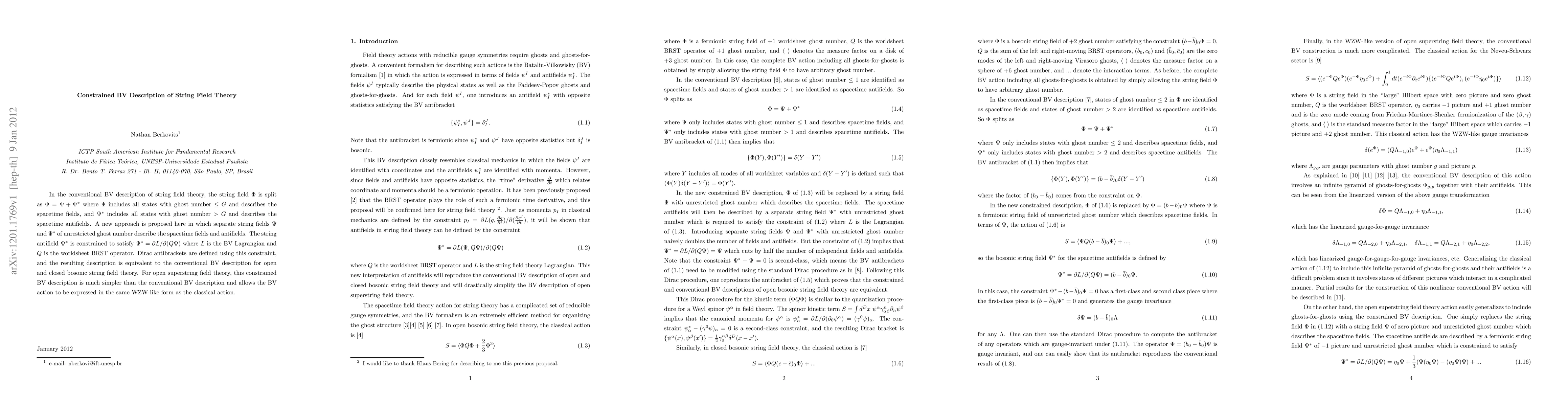 In the conventional BV description of string field theory, the string field Phi is split as Phi = Psi+Psi* where Psi includes all states with ghost number less than or equal to G and describes the spacetime fields, and Psi* includes all states with ghost number >G and describes the spacetime antifields. A new approach is proposed here in which separate string fields Psi and Psi* of unrestricted ghost number describe the spacetime fields and antifields. The string antifield Psi* is constrained to satisfy Psi* = {\partial L}/{\partial(Q Psi)} where L is the BV Lagrangian and Q is the worldsheet BRST operator. Dirac antibrackets are defined using this constraint, and the resulting description is equivalent to the conventional BV description for open and closed bosonic string field theory. For open superstring field theory, this constrained BV description is much simpler than the conventional BV description and allows the BV action to be expressed in the same WZW-like form as the classical action.