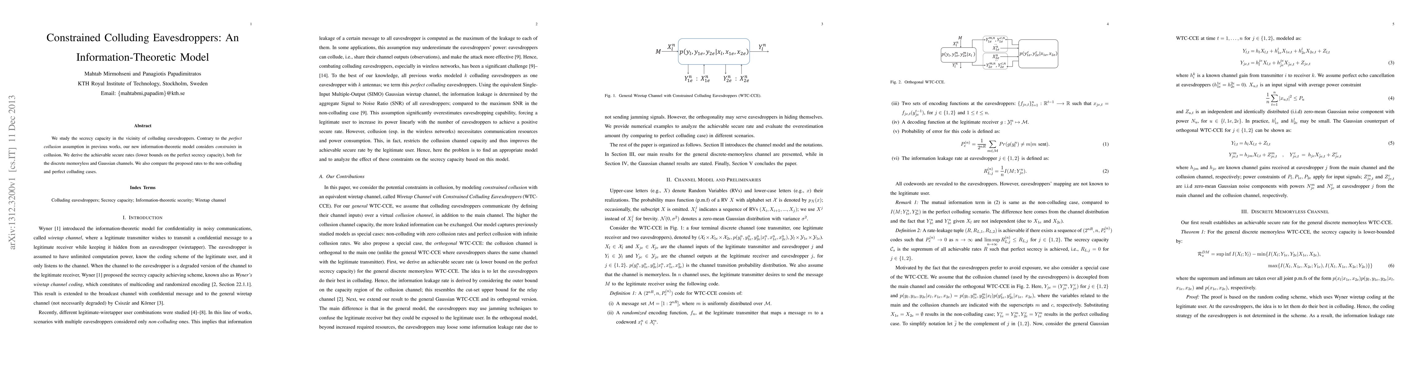 This paper introduces an information-theoretic model for constrained colluding eavesdroppers, deriving achievable secure rates for both discrete memoryless and Gaussian channels. It contrasts with previous models by considering collusion constraints and compares the proposed rates to non-colluding and perfect collusion scenarios.