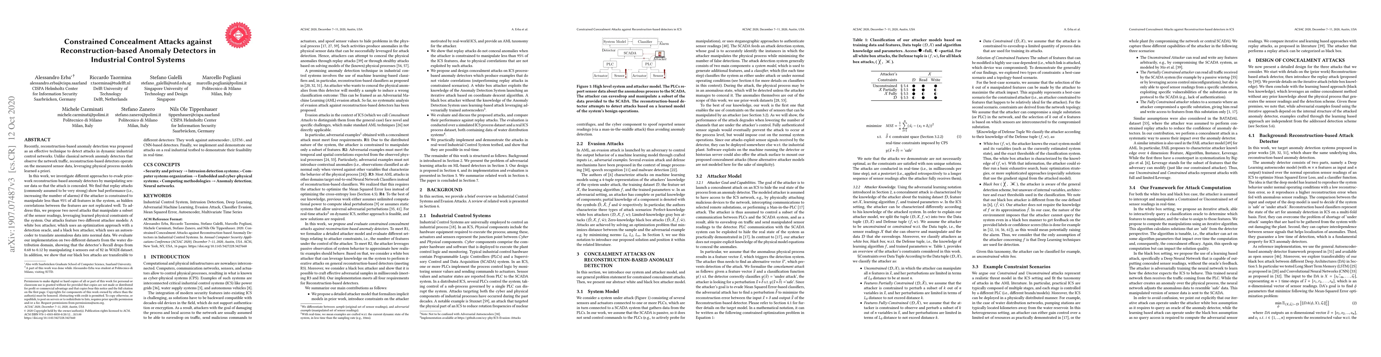 Researchers found that even constrained concealment attacks can evade reconstruction-based anomaly detectors in industrial control systems with high accuracy. They developed new attack methods using optimization and autoencoders to manipulate sensor data and demonstrate their feasibility on real-world testbeds.