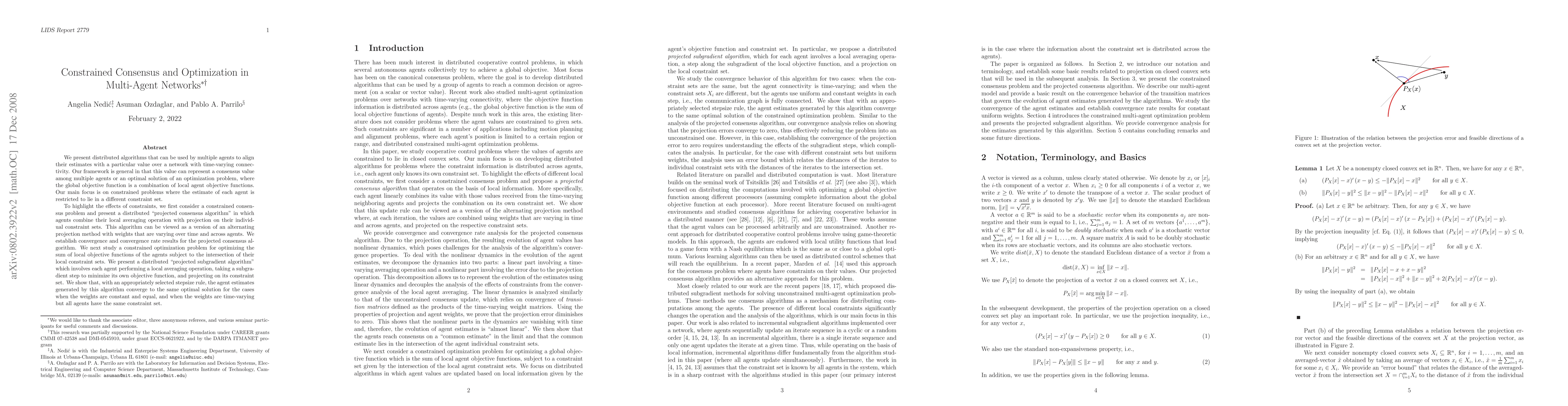 We present distributed algorithms that can be used by multiple agents to align their estimates with a particular value over a network with time-varying connectivity. Our framework is general in that this value can represent a consensus value among multiple agents or an optimal solution of an optimization problem, where the global objective function is a combination of local agent objective functions. Our main focus is on constrained problems where the estimate of each agent is restricted to lie in a different constraint set. To highlight the effects of constraints, we first consider a constrained consensus problem and present a distributed ``projected consensus algorithm'' in which agents combine their local averaging operation with projection on their individual constraint sets. This algorithm can be viewed as a version of an alternating projection method with weights that are varying over time and across agents. We establish convergence and convergence rate results for the projected consensus algorithm. We next study a constrained optimization problem for optimizing the sum of local objective functions of the agents subject to the intersection of their local constraint sets. We present a distributed ``projected subgradient algorithm'' which involves each agent performing a local averaging operation, taking a subgradient step to minimize its own objective function, and projecting on its constraint set. We show that, with an appropriately selected stepsize rule, the agent estimates generated by this algorithm converge to the same optimal solution for the cases when the weights are constant and equal, and when the weights are time-varying but all agents have the same constraint set.