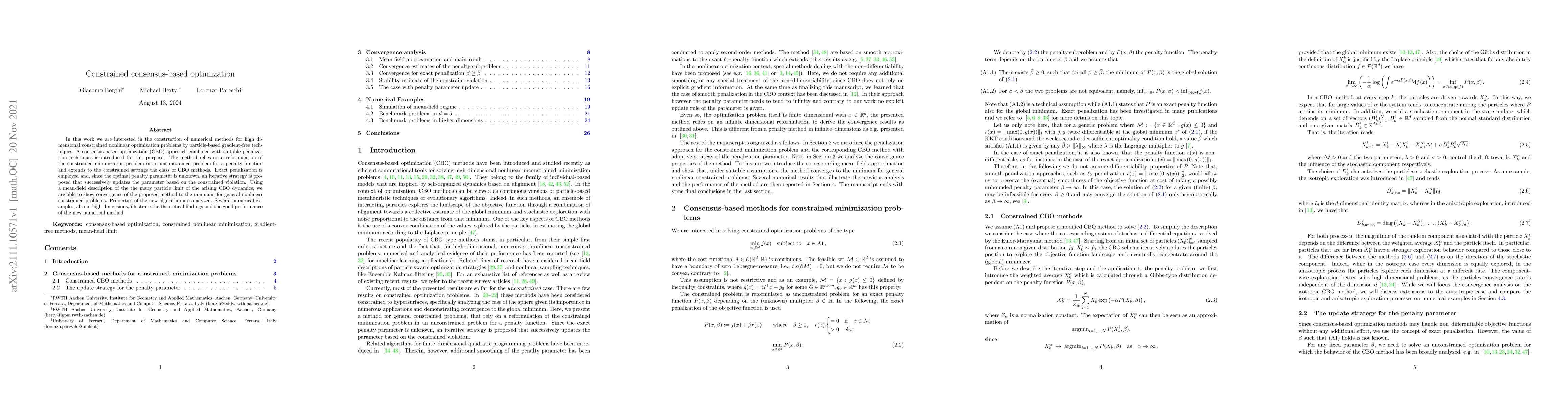 This paper introduces a consensus-based optimization method for high-dimensional constrained nonlinear optimization, employing exact penalization and iterative updates to the penalty parameter. The method converges to the minimum for general nonlinear problems, as demonstrated through theoretical analysis and numerical examples.