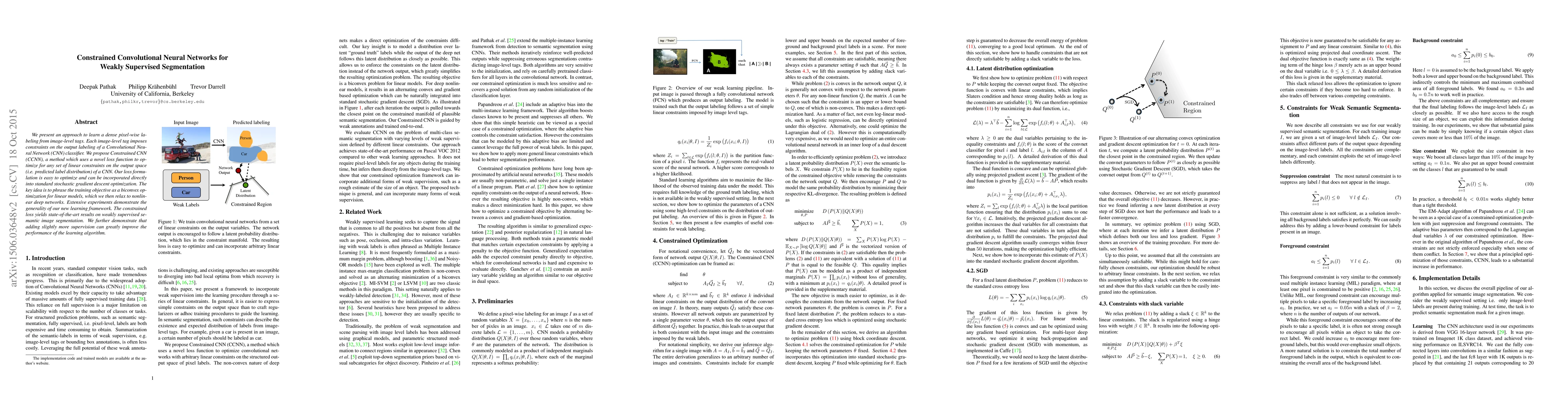 This paper introduces a Constrained Convolutional Neural Network (CCNN) for weakly supervised segmentation, optimizing a novel loss function that incorporates image-level tags as constraints on the output label distribution. The approach demonstrates state-of-the-art performance in weakly supervised semantic image segmentation and shows significant improvement with additional supervision.