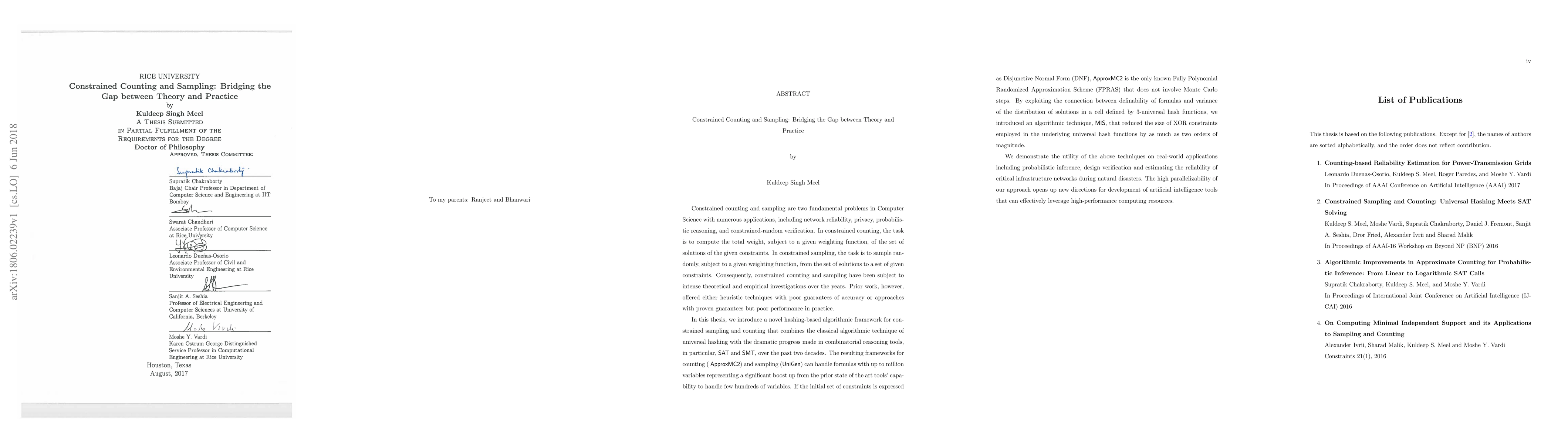 Constrained counting and sampling are two fundamental problems in Computer Science with numerous applications, including network reliability, privacy, probabilistic reasoning, and constrained-random verification. In constrained counting, the task is to compute the total weight, subject to a given weighting function, of the set of solutions of the given constraints. In constrained sampling, the task is to sample randomly, subject to a given weighting function, from the set of solutions to a set of given constraints. Consequently, constrained counting and sampling have been subject to intense theoretical and empirical investigations over the years. Prior work, however, offered either heuristic techniques with poor guarantees of accuracy or approaches with proven guarantees but poor performance in practice. In this thesis, we introduce a novel hashing-based algorithmic framework for constrained sampling and counting that combines the classical algorithmic technique of universal hashing with the dramatic progress made in combinatorial reasoning tools, in particular, SAT and SMT, over the past two decades. The resulting frameworks for counting (ApproxMC2) and sampling (UniGen) can handle formulas with up to million variables representing a significant boost up from the prior state of the art tools' capability to handle few hundreds of variables. If the initial set of constraints is expressed as Disjunctive Normal Form (DNF), ApproxMC is the only known Fully Polynomial Randomized Approximation Scheme (FPRAS) that does not involve Monte Carlo steps. By exploiting the connection between definability of formulas and variance of the distribution of solutions in a cell defined by 3-universal hash functions, we introduced an algorithmic technique, MIS, that reduced the size of XOR constraints employed in the underlying universal hash functions by as much as two orders of magnitude.