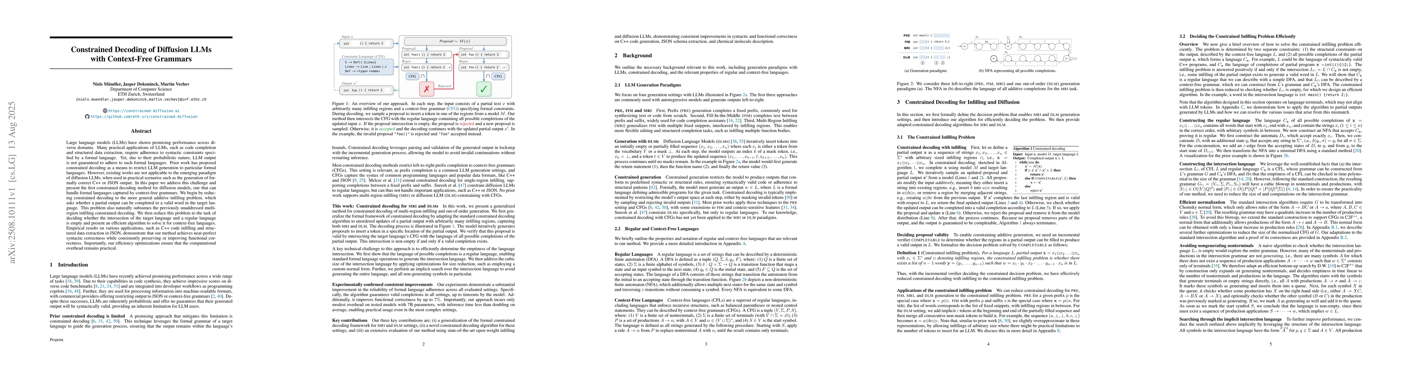 Large language models (LLMs) have shown promising performance across diverse domains. Many practical applications of LLMs, such as code completion and structured data extraction, require adherence to syntactic constraints specified by a formal language. Yet, due to their probabilistic nature, LLM output is not guaranteed to adhere to such formal languages. Prior work has proposed constrained decoding as a means to restrict LLM generation to particular formal languages. However, existing works are not applicable to the emerging paradigm of diffusion LLMs, when used in practical scenarios such as the generation of formally correct C++ or JSON output. In this paper we address this challenge and present the first constrained decoding method for diffusion models, one that can handle formal languages captured by context-free grammars. We begin by reducing constrained decoding to the more general additive infilling problem, which asks whether a partial output can be completed to a valid word in the target language. This problem also naturally subsumes the previously unaddressed multi-region infilling constrained decoding. We then reduce this problem to the task of deciding whether the intersection of the target language and a regular language is empty and present an efficient algorithm to solve it for context-free languages. Empirical results on various applications, such as C++ code infilling and structured data extraction in JSON, demonstrate that our method achieves near-perfect syntactic correctness while consistently preserving or improving functional correctness. Importantly, our efficiency optimizations ensure that the computational overhead remains practical.