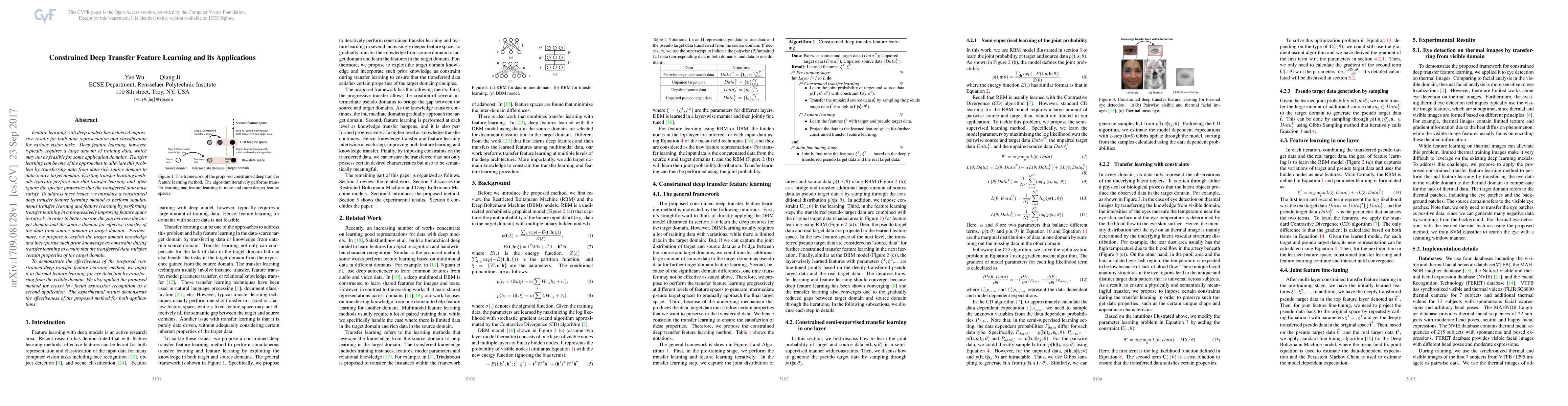 This paper introduces a constrained deep transfer feature learning method to address the challenge of limited training data in target domains by transferring knowledge from a data-rich source domain. The method iteratively refines feature spaces and incorporates target domain constraints to ensure effective data transfer, demonstrated through applications in thermal eye detection and cross-view facial expression recognition.