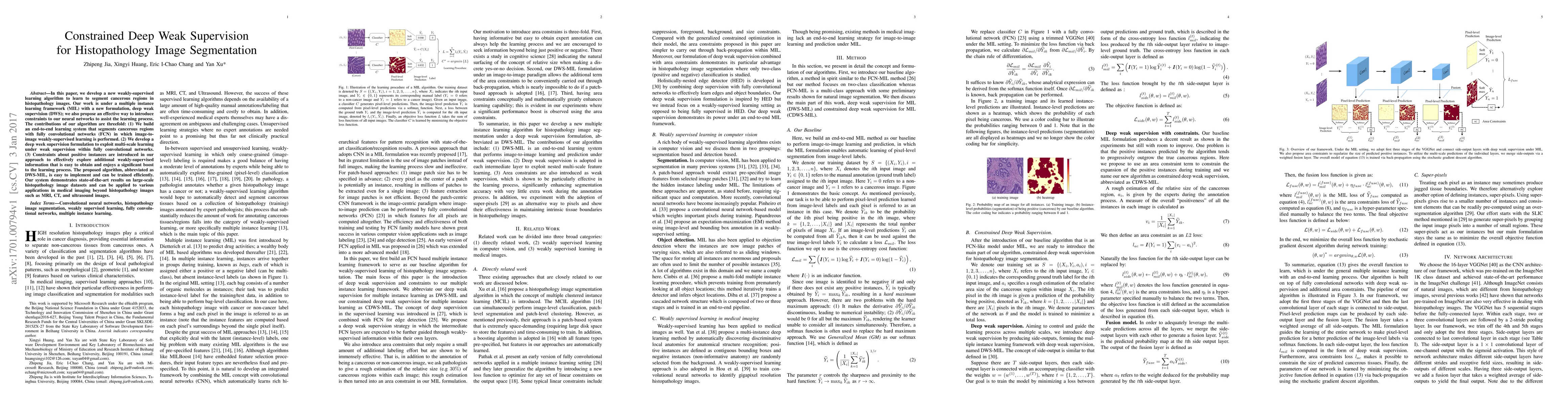 This paper introduces a novel weakly-supervised learning algorithm, DWS-MIL, for segmenting cancerous regions in histopathology images, leveraging deep weak supervision and constraints to enhance learning. The method achieves state-of-the-art results on large-scale datasets and shows potential for broader medical imaging applications.