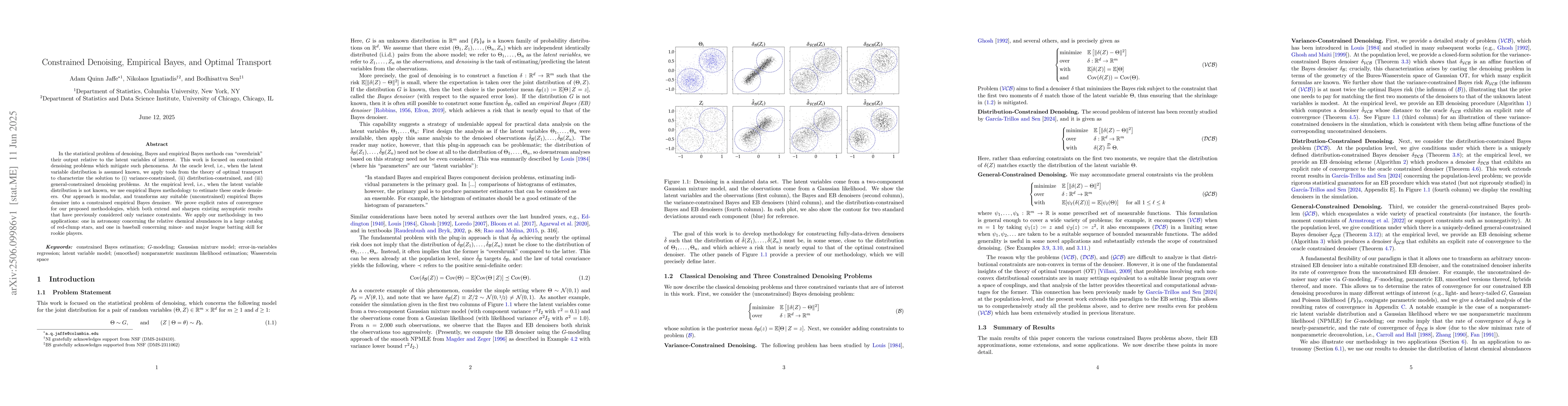 In the statistical problem of denoising, Bayes and empirical Bayes methods can "overshrink" their output relative to the latent variables of interest. This work is focused on constrained denoising problems which mitigate such phenomena. At the oracle level, i.e., when the latent variable distribution is assumed known, we apply tools from the theory of optimal transport to characterize the solution to (i) variance-constrained, (ii) distribution-constrained, and (iii) general-constrained denoising problems. At the empirical level, i.e., when the latent variable distribution is not known, we use empirical Bayes methodology to estimate these oracle denoisers. Our approach is modular, and transforms any suitable (unconstrained) empirical Bayes denoiser into a constrained empirical Bayes denoiser. We prove explicit rates of convergence for our proposed methodologies, which both extend and sharpen existing asymptotic results that have previously considered only variance constraints. We apply our methodology in two applications: one in astronomy concerning the relative chemical abundances in a large catalog of red-clump stars, and one in baseball concerning minor- and major league batting skill for rookie players.