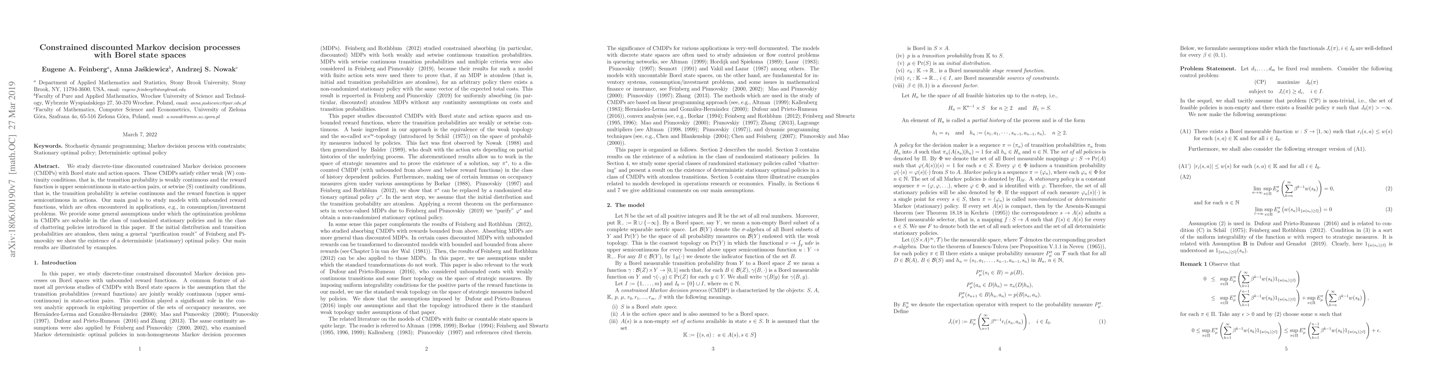 This paper investigates discounted constrained Markov decision processes (CMDPs) on Borel spaces with unbounded reward functions, focusing on weakly or set-wise continuous transition probabilities and semicontinuous reward functions. It establishes conditions under which the optimization problems are solvable using stationary randomized policies, and shows that optimal policies can be deterministic if initial conditions and transition probabilities are non-atomic.