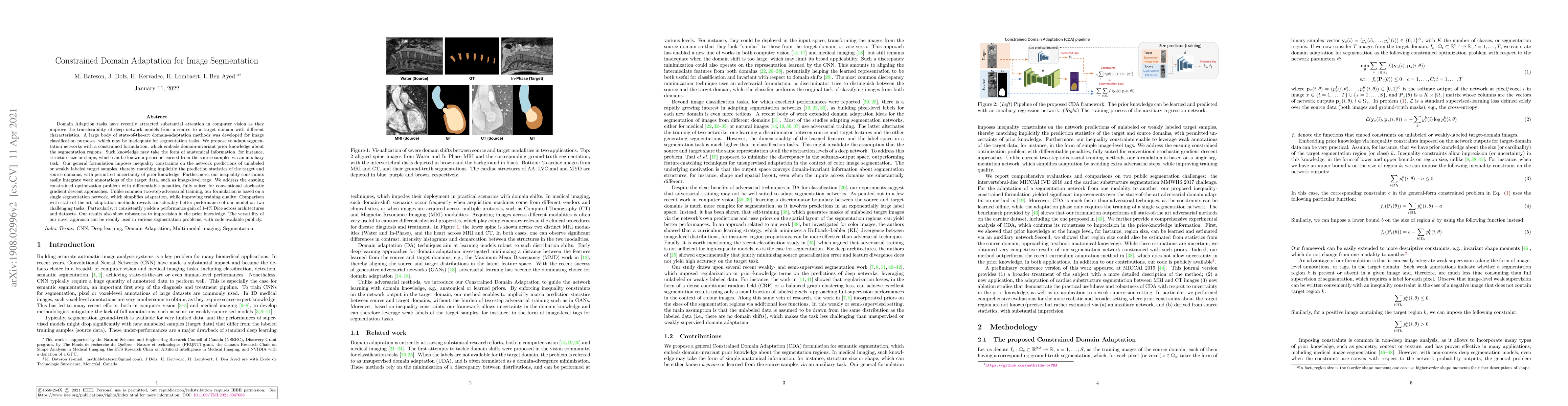 We propose to adapt segmentation networks with a constrained formulation, which embeds domain-invariant prior knowledge about the segmentation regions. Such knowledge may take the form of simple anatomical information, e.g., structure size or shape, estimated from source samples or known a priori. Our method imposes domain-invariant inequality constraints on the network outputs of unlabeled target samples. It implicitly matches prediction statistics between target and source domains with permitted uncertainty of prior knowledge. We address our constrained problem with a differentiable penalty, fully suited for standard stochastic gradient descent approaches, removing the need for computationally expensive Lagrangian optimization with dual projections. Unlike current two-step adversarial training, our formulation is based on a single loss in a single network, which simplifies adaptation by avoiding extra adversarial steps, while improving convergence and quality of training. The comparison of our approach with state-of-the-art adversarial methods reveals substantially better performance on the challenging task of adapting spine segmentation across different MRI modalities. Our results also show a robustness to imprecision of size priors, approaching the accuracy of a fully supervised model trained directly in a target domain.Our method can be readily used for various constraints and segmentation problems.
