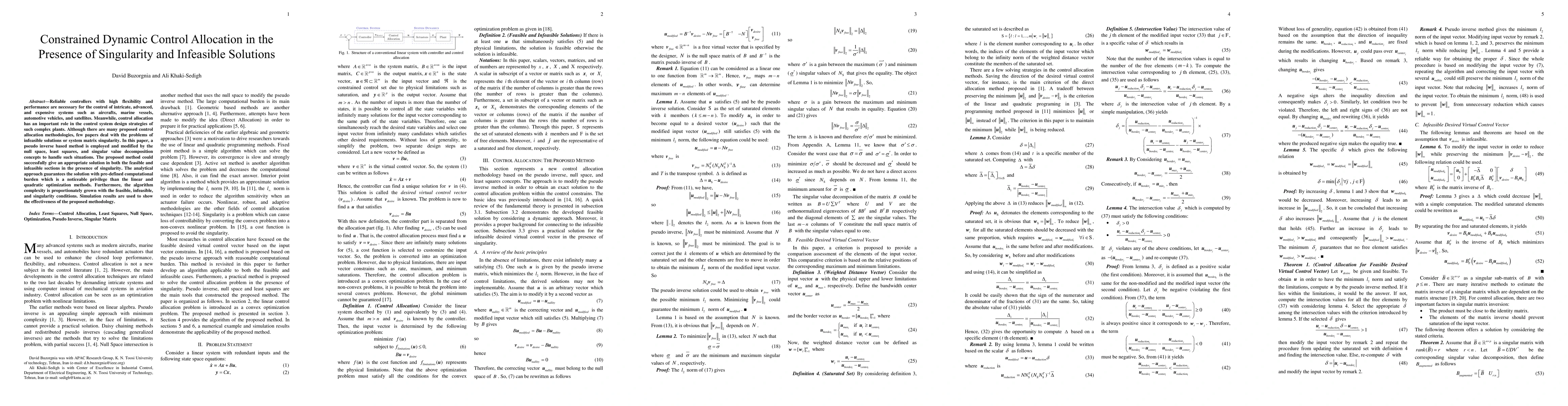 A new method is proposed to handle infeasible solutions and system matrix singularity in control allocation, offering a computationally efficient solution with guaranteed performance and flexibility.