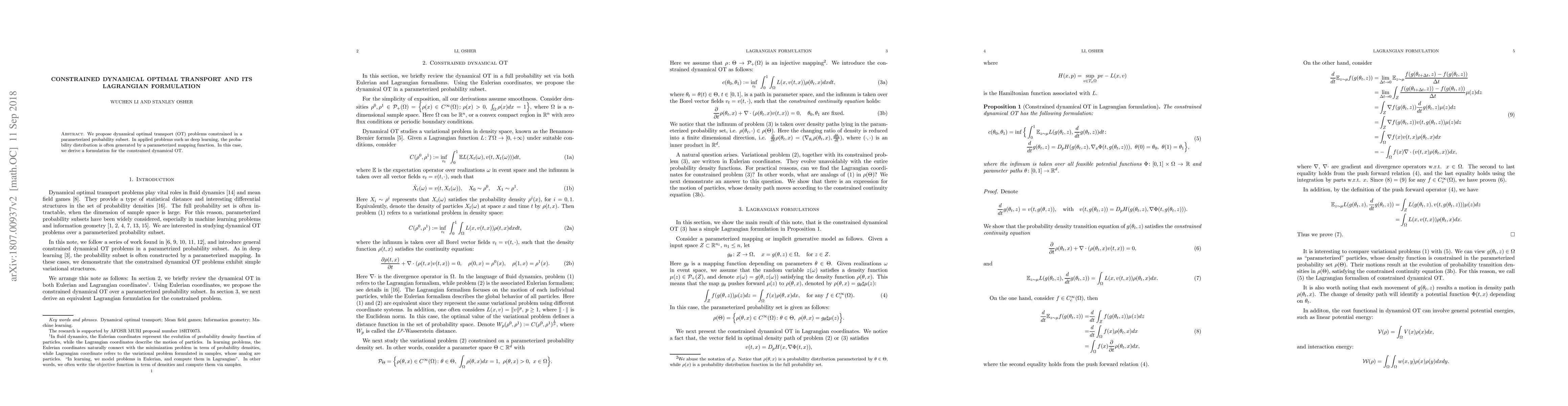 We propose dynamical optimal transport (OT) problems constrained in a parameterized probability subset. In application problems such as deep learning, the probability distribution is often generated by a parameterized mapping function. In this case, we derive a simple formulation for the constrained dynamical OT.