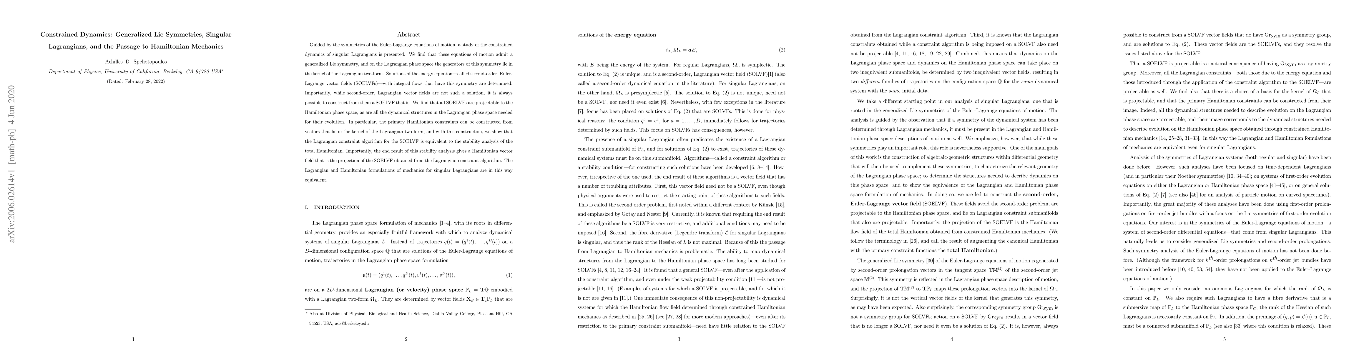 Guided by the symmetries of the Euler-Lagrange equations of motion, a study of the constrained dynamics of singular Lagrangians is presented. We find that these equations of motion admit a generalized Lie symmetry, and on the Lagrangian phase space the generators of this symmetry lie in the kernel of the Lagrangian two-form. Solutions of the energy equation\textemdash called second-order, Euler-Lagrange vector fields (SOELVFs)\textemdash with integral flows that have this symmetry are determined. Importantly, while second-order, Lagrangian vector fields are not such a solution, it is always possible to construct from them a SOELVF that is. We find that all SOELVFs are projectable to the Hamiltonian phase space, as are all the dynamical structures in the Lagrangian phase space needed for their evolution. In particular, the primary Hamiltonian constraints can be constructed from vectors that lie in the kernel of the Lagrangian two-form, and with this construction, we show that the Lagrangian constraint algorithm for the SOELVF is equivalent to the stability analysis of the total Hamiltonian. Importantly, the end result of this stability analysis gives a Hamiltonian vector field that is the projection of the SOELVF obtained from the Lagrangian constraint algorithm. The Lagrangian and Hamiltonian formulations of mechanics for singular Lagrangians are in this way equivalent.
