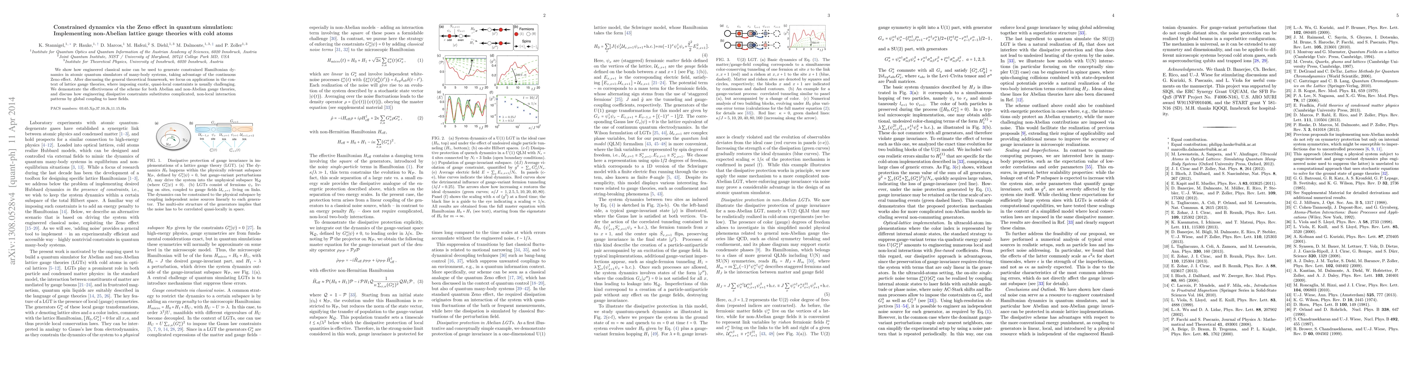 This paper demonstrates how engineered classical noise leverages the Zeno effect to create constrained Hamiltonian dynamics in atomic quantum simulators, facilitating the simulation of both Abelian and non-Abelian lattice gauge theories. The approach simplifies complex, non-local interactions by using global laser field coupling.