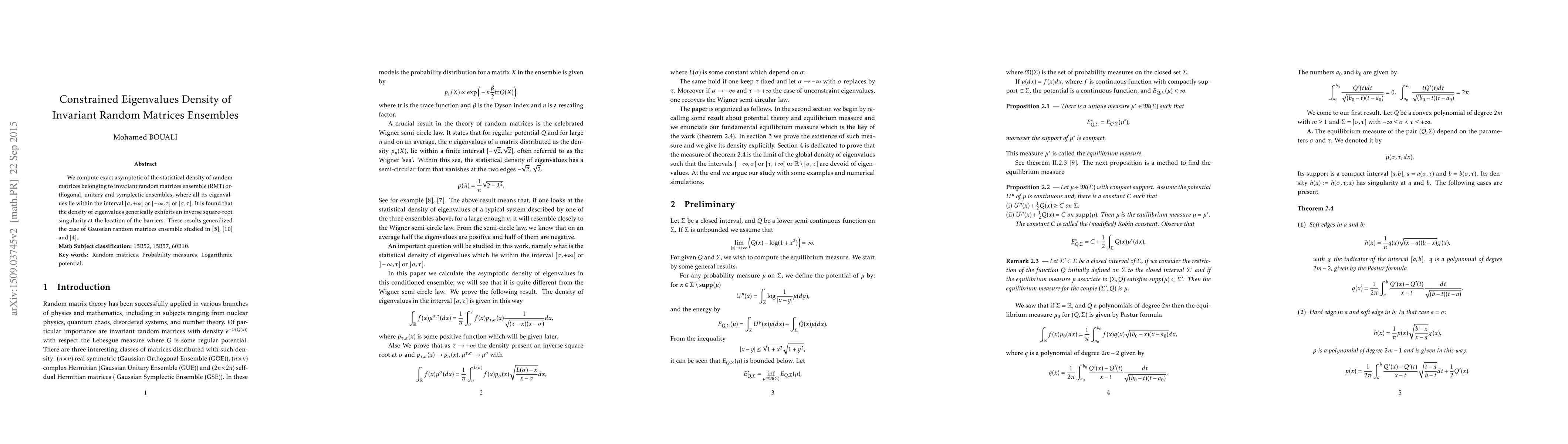 Summary: The paper computes the asymptotic density of eigenvalues in invariant random matrix ensembles (orthogonal, unitary, and symplectic) constrained within specified intervals, revealing an inverse square-root singularity at the boundaries, extending earlier findings for Gaussian random matrices.
