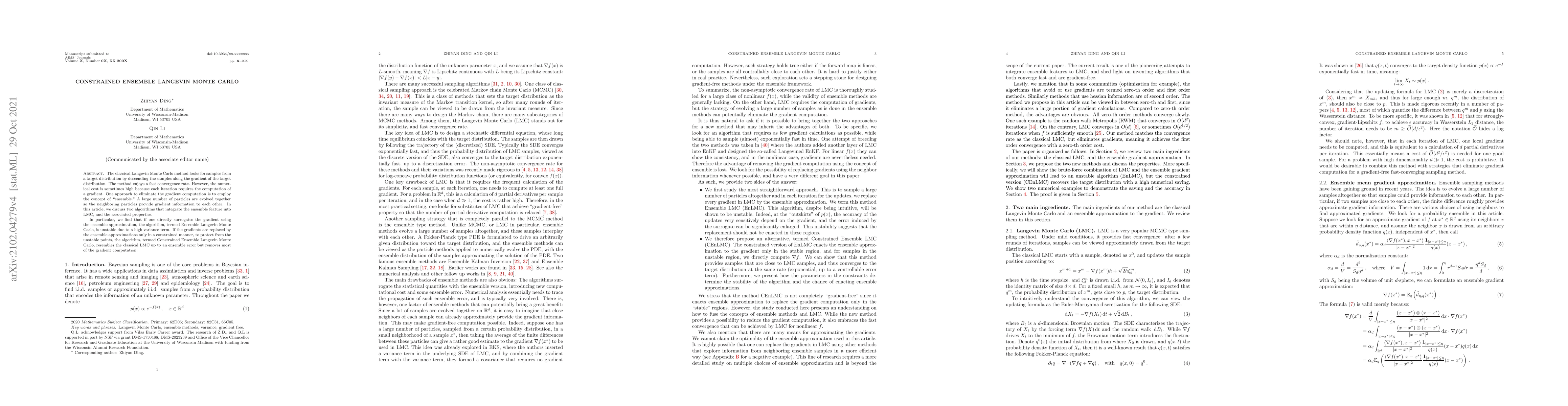 This paper proposes two algorithms that integrate ensemble methods into the Langevin Monte Carlo (LMC) framework to reduce gradient computation costs. The Ensemble Langevin Monte Carlo is unstable due to high variance, while the Constrained Ensemble Langevin Monte Carlo stabilizes the approach by using ensemble approximations in a constrained manner, achieving similar performance to classical LMC with reduced gradient computations.