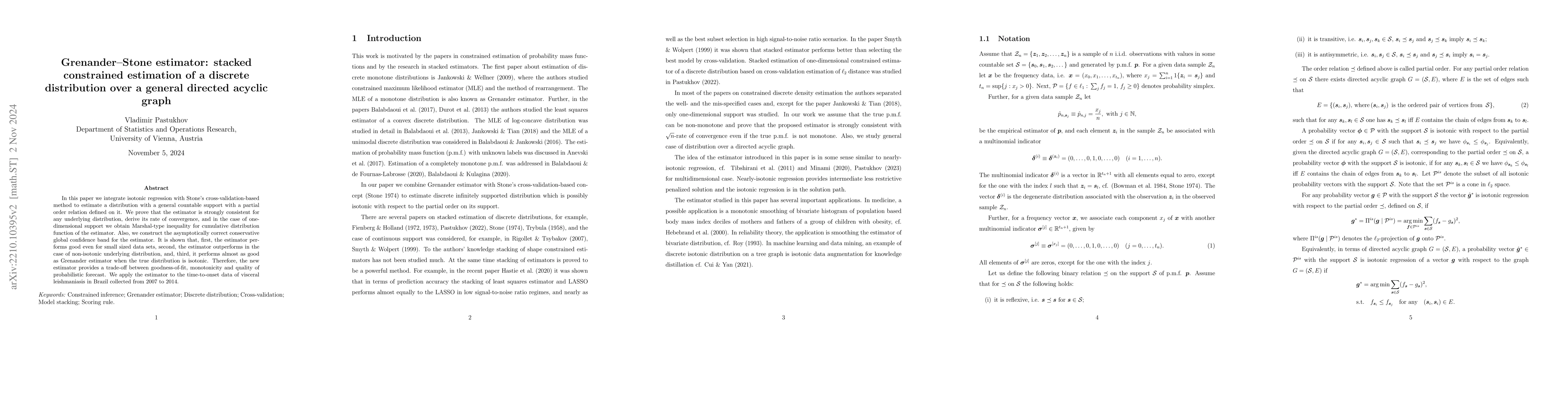 In this paper we integrate the isotonic regression with Stone's cross-validation-based method to estimate discrete infinitely supported distribution. We prove that the estimator is strongly consistent, derive its rate of convergence for any underlying distribution, and for one-dimensional case we derive Marshal-type inequality for cumulative distribution function of the estimator. Also, we construct the asymptotically correct conservative global confidence band for the estimator. It is shown that, first, the estimator performs good even for small sized data sets, second, the estimator outperforms in the case of non-monotone underlying distribution, and, third, it performs almost as good as Grenander estimator when the true distribution is isotonic. Therefore, the new estimator provides a trade-off between goodness-of-fit, monotonicity and quality of probabilistic forecast. We apply the estimator to the time-to-onset data of visceral leishmaniasis in Brazil collected from 2007 to 2014.