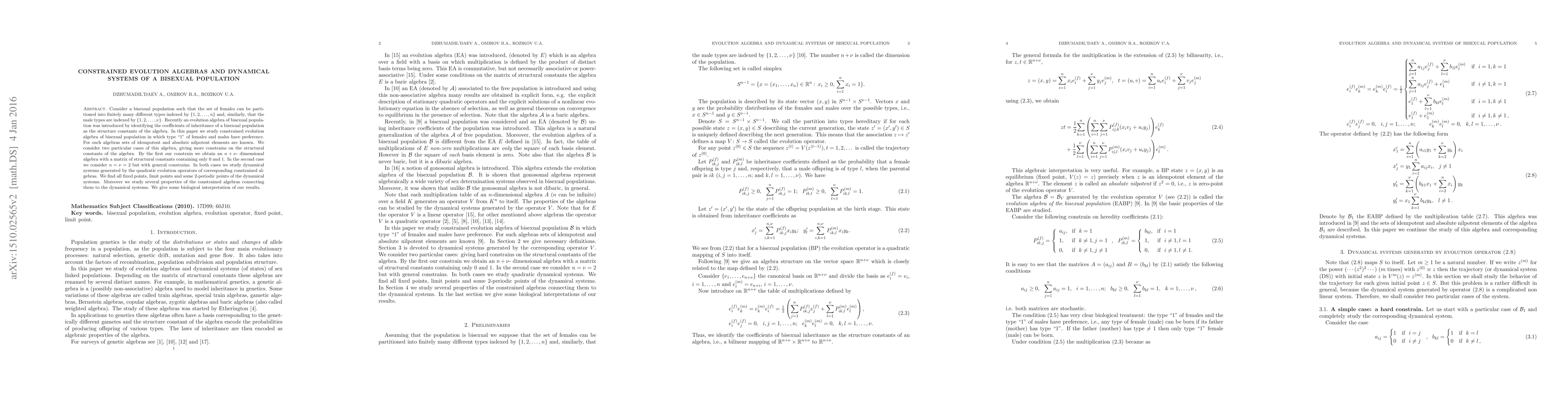 Consider a bisexual population such that the set of females can be partitioned into finitely many different types indexed by $\{1,2,\dots,n\}$ and, similarly, that the male types are indexed by $\{1,2,\dots,\nu \}$. Recently an evolution algebra of bisexual population was introduced by identifying the coefficients of inheritance of a bisexual population as the structure constants of the algebra. In this paper we study constrained evolution algebra of bisexual population in which type "1" of females and males have preference. For such algebras sets of idempotent and absolute nilpotent elements are known. We consider two particular cases of this algebra, giving more constrains on the structural constants of the algebra. By the first our constrain we obtain an $n+\nu$- dimensional algebra with a matrix of structural constants containing only 0 and 1. In the second case we consider $n=\nu=2$ but with general constrains. In both cases we study dynamical systems generated by the quadratic evolution operators of corresponding constrained algebras. We find all fixed points, limit points and some 2-periodic points of the dynamical systems. Moreover we study several properties of the constrained algebras connecting them to the dynamical systems. We give some biological interpretation of our results.