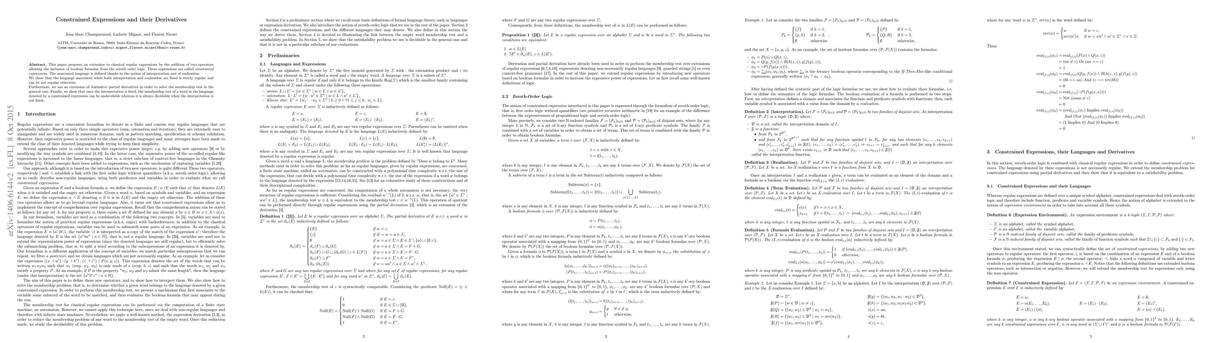 This paper proposes an extension to classical regular expressions by the addition of two operators allowing the inclusion of boolean formulae from the zeroth order logic. These expressions are called constrained expressions. The associated language is defined thanks to the notion of interpretation and of realization. We show that the language associated when both interpretation and realization are fixed is stricly regular and can be not regular otherwise. Furthermore, we use an extension of Antimirov partial derivatives in order to solve the membership test in the general case. Finally, we show that once the interpretation is fixed, the membership test of a word in the language denoted by a constrained expression can be undecidable whereas it is always decidable when the interpretation is not fixed.