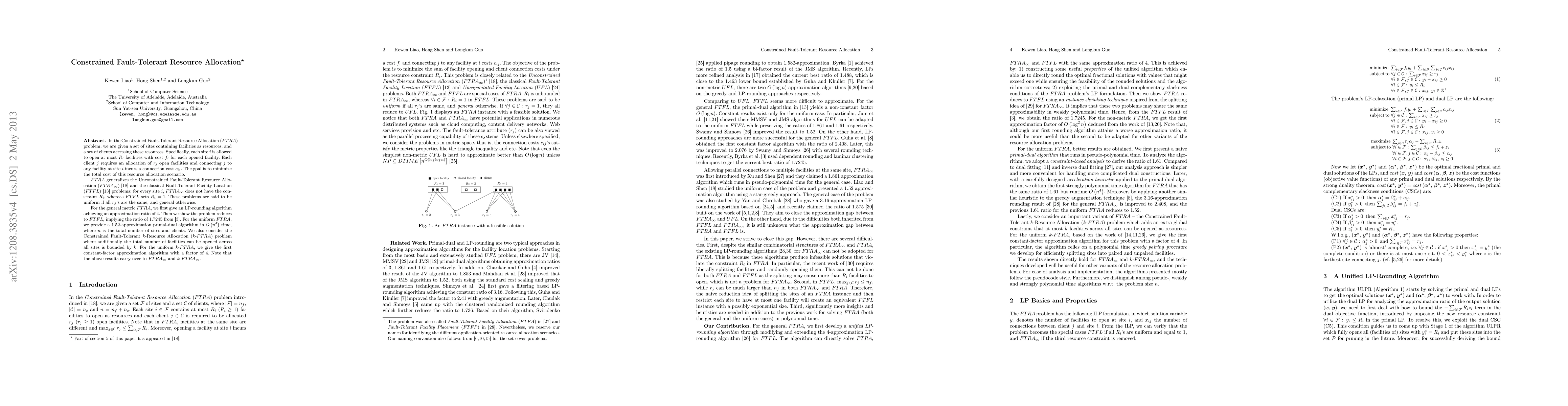 This paper addresses the Constrained Fault-Tolerant Resource Allocation (FTRA) problem, aiming to minimize total cost by optimally allocating facilities to clients while considering fault tolerance and resource constraints. The authors provide approximation algorithms for both general and uniform FTRA, achieving ratios of 4 and 1.52 respectively, and extend their findings to a bounded facility version, k-FTRA.