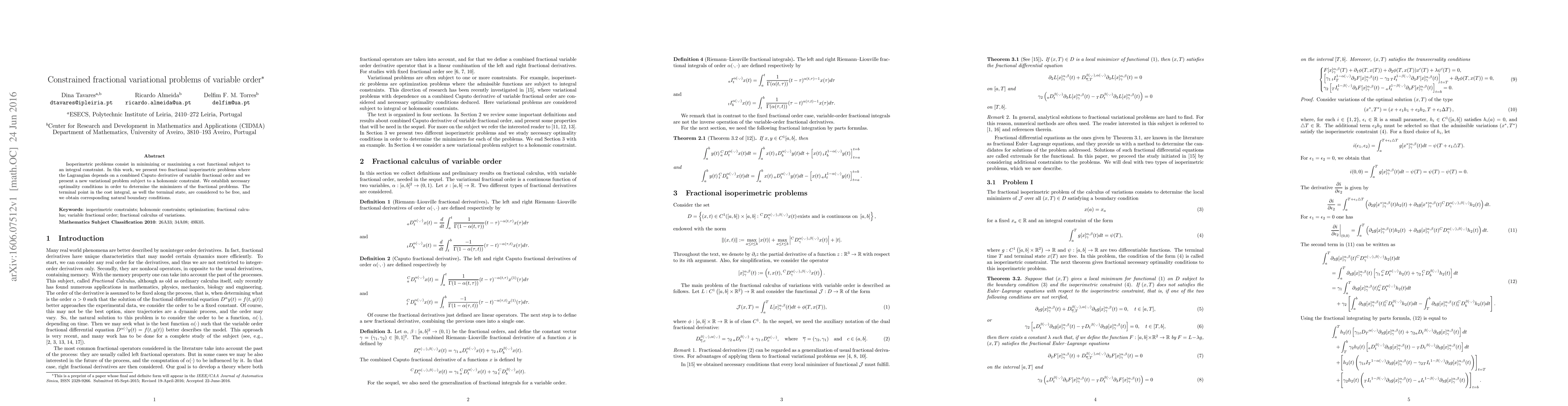 This paper investigates constrained fractional variational problems with variable order, focusing on two isoperimetric problems involving a Caputo derivative. Necessary optimality conditions and natural boundary conditions are derived to determine the minimizers.
