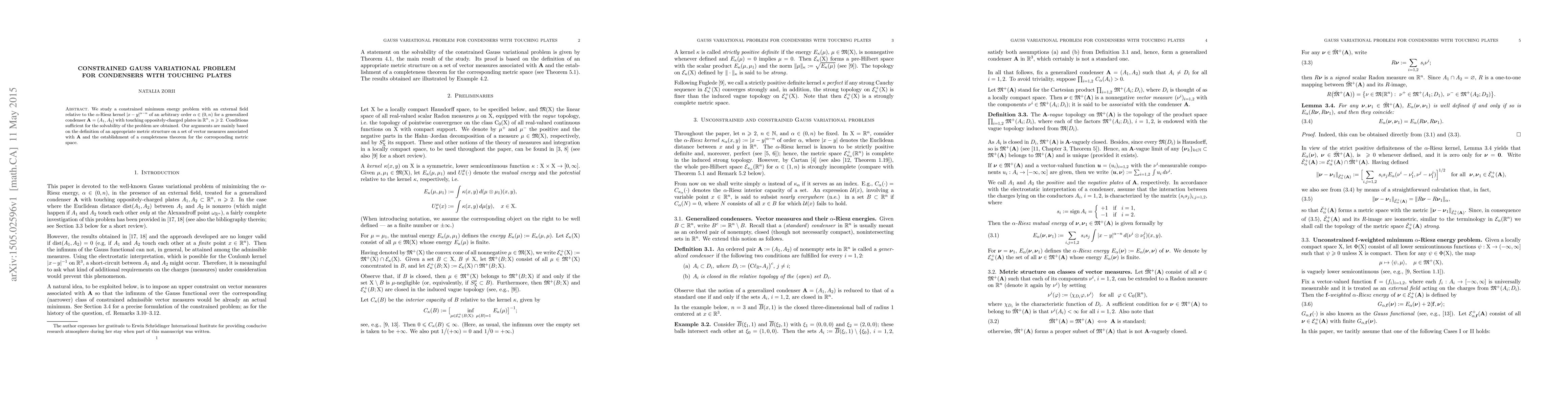We study a constrained minimum energy problem with an external field relative to the Riesz kernel of an arbitrary order for a generalized condenser with touching oppositely-charged plates. Conditions sufficient for the solvability of the problem are obtained. Our arguments are mainly based on the definition of an appropriate metric structure on a set of vector measures associated with a generalized condenser and the establishment of a completeness theorem for the corresponding metric space.