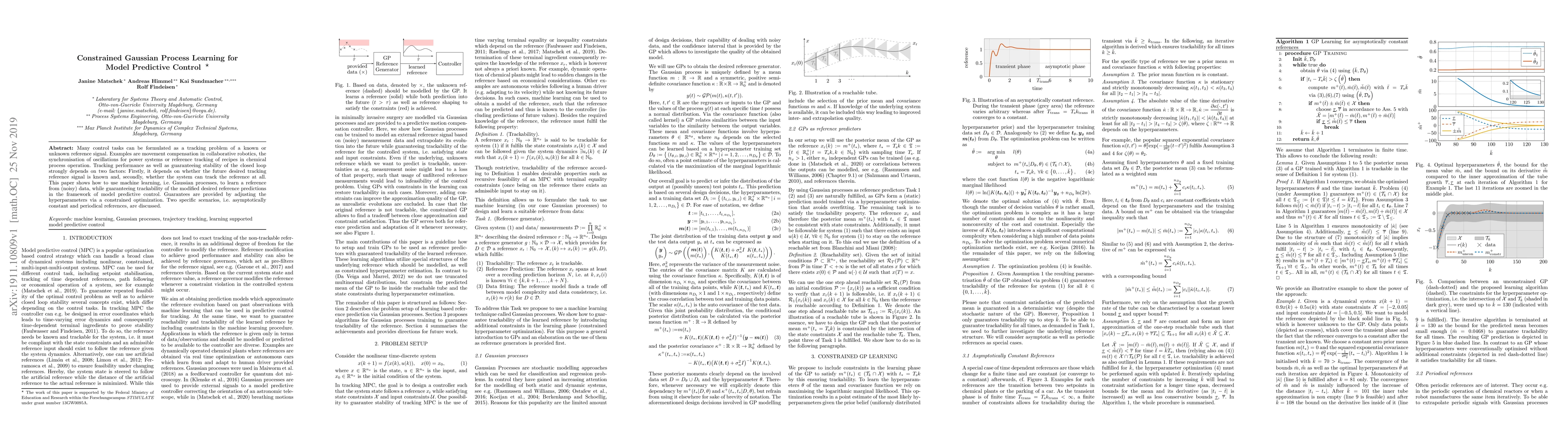 This paper uses Gaussian processes to learn a reference signal from noisy data, ensuring it can be tracked by model predictive control while guaranteeing stability. It provides constrained optimization for hyperparameter adjustment in specific scenarios.