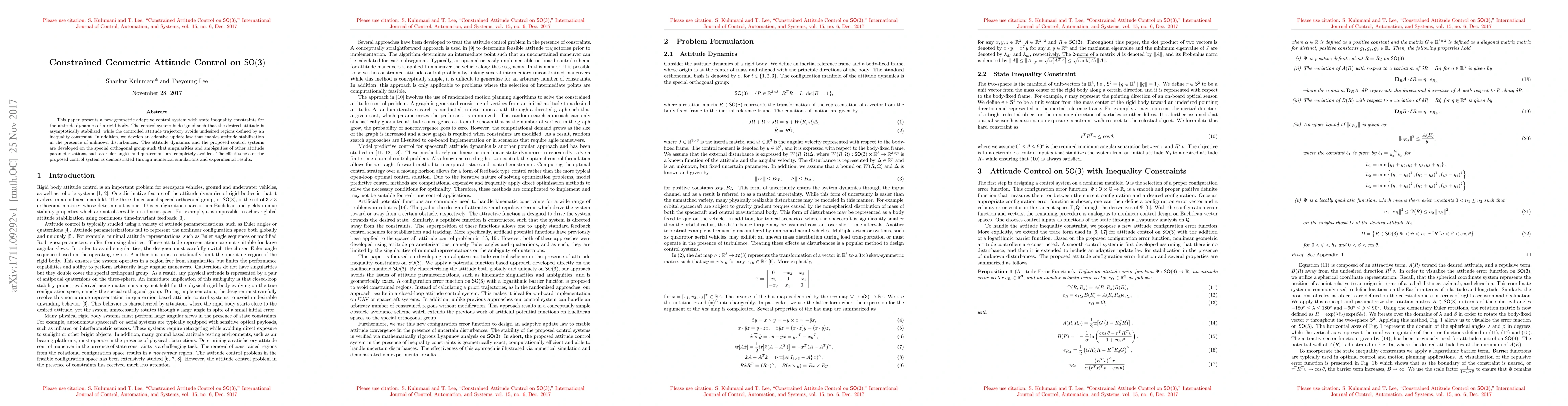 This paper presents a new geometric adaptive control system with state inequality constraints for the attitude dynamics of a rigid body. The control system is designed such that the desired attitude is asymptotically stabilized, while the controlled attitude trajectory avoids undesired regions defined by an inequality constraint. In addition, we develop an adaptive update law that enables attitude stabilization in the presence of unknown disturbances. The attitude dynamics and the proposed control systems are developed on the special orthogonal group such that singularities and ambiguities of other attitude parameterizations, such as Euler angles and quaternions are completely avoided. The effectiveness of the proposed control system is demonstrated through numerical simulations and experimental results.