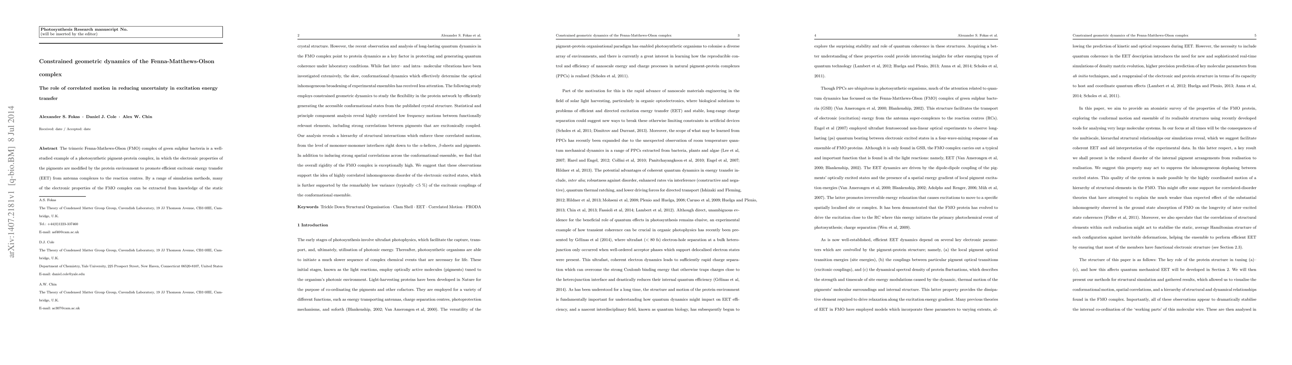 The Fenna Mathews Olson (FMO) complex of green sulphur bacteria is an example of a photosynthetic pigment protein complex, in which the electronic properties of the pigments are modified by the protein environment to promote efficient excitonic energy transfer from antenna complexes to the reaction centres. Many of the electronic properties of the FMO complex can be extracted from knowledge of the static crystal structure. However, the recent observation and analysis of long lasting quantum dynamics in the FMO complex point to protein dynamics as a key factor in protecting and generating quantum coherence under laboratory conditions. While fast inter and intra molecular vibrations have been investigated extensively, the slow dynamics which effectively determine the optical inhomogeneous broadening of experimental ensembles has received less attention. Our study employs constrained geometric dynamics to study the flexibility in the protein network by efficiently generating the accessible conformational states from the published crystal structure. Statistical and principle component analysis reveal highly correlated low frequency motions between functionally relevant elements, including strong correlations between pigments that are excitonically coupled. Our analysis reveals a hierarchy of structural interactions which enforce these correlated motions, from the level of monomer monomer interfaces right down to the alpha helices, beta sheets and pigments. In addition to inducing strong spatial correlations across the conformational ensemble, we find that the overall rigidity of the FMO complex is exceptionally high. We suggest that these observations support the idea of highly correlated inhomogeneous disorder of the electronic excited states, which is further supported by the remarkably low variance of the excitonic couplings of the conformational ensemble.