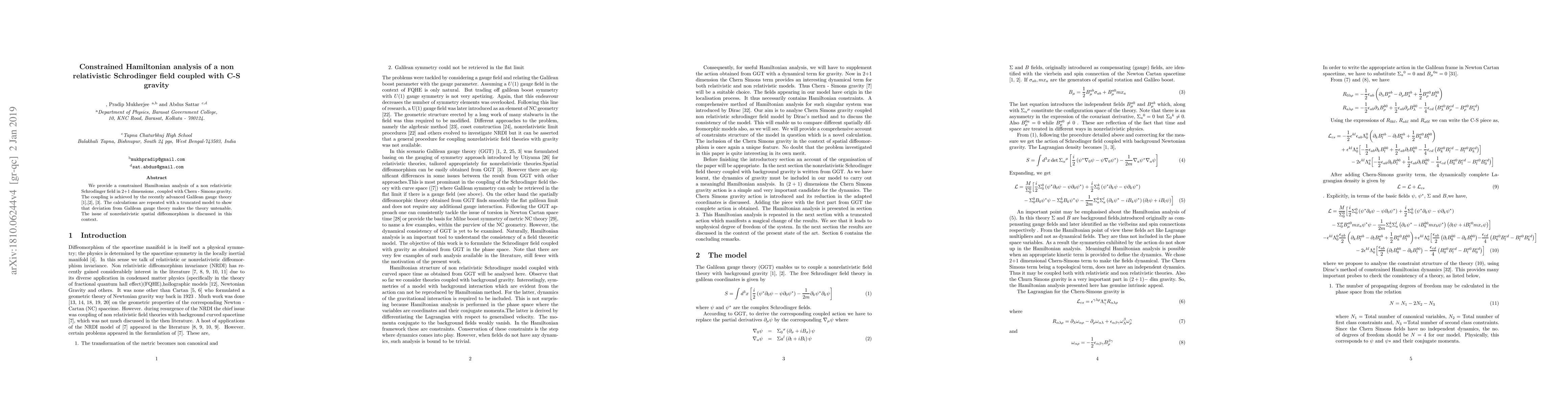 We provide a constrained Hamiltonian analysis of a non relativistic Schrodinger field in 2+1 dimensions , coupled with Chern - Simons gravity. The coupling is achieved by the recently advanced Galilean gauge theory \cite{BMM1},\cite{ BMM2}, \cite{BM4}. The calculations are repeated with a truncated model to show that deviation from Galilean gauge theory makes the theory untenable. The issue of nonrelativistic spatial diffeomorphism is discussed in this context.