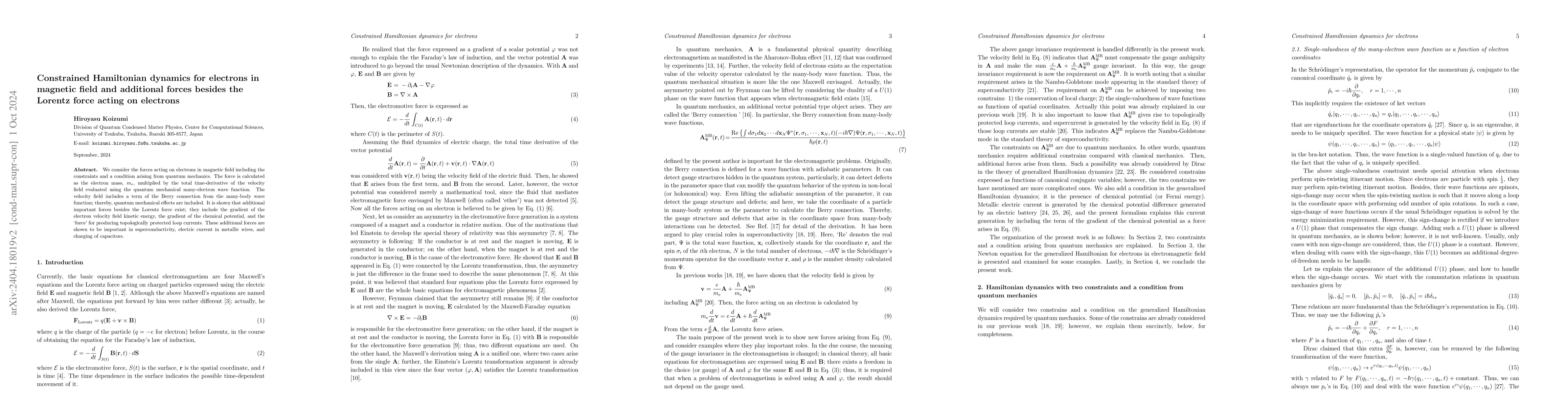 We consider the forces acting on electrons in magnetic field including the constraints and a condition arising from quantum mechanics. The force is calculated as the electron mass, $m_e$, multiplied by the total time-derivative of the velocity field evaluated using the quantum mechanical many-electron wave function. The velocity field includes a term of the Berry connection from the many-body wave function; thereby, quantum mechanical effects are included. It is shown that additional important forces besides the Lorentz force exist; they include the gradient of the electron velocity field kinetic energy, the gradient of the chemical potential, and the `force' for producing topologically protected loop currents. These additional forces are shown to be important in superconductivity, electric current in metallic wires, and charging of capacitors.