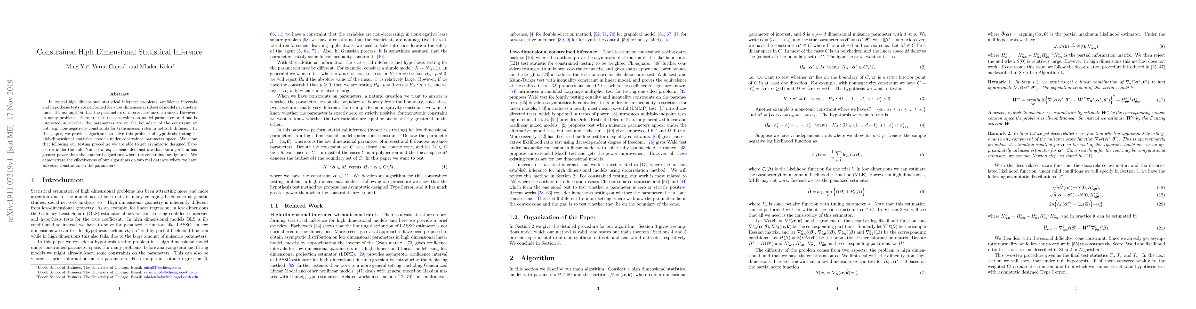 This paper develops algorithms for hypothesis testing in high-dimensional statistical models with constrained parameters, showing improved power over standard methods that ignore constraints. The proposed testing procedure maintains asymptotic Type I error under the null hypothesis, as demonstrated through numerical experiments and real-world datasets.