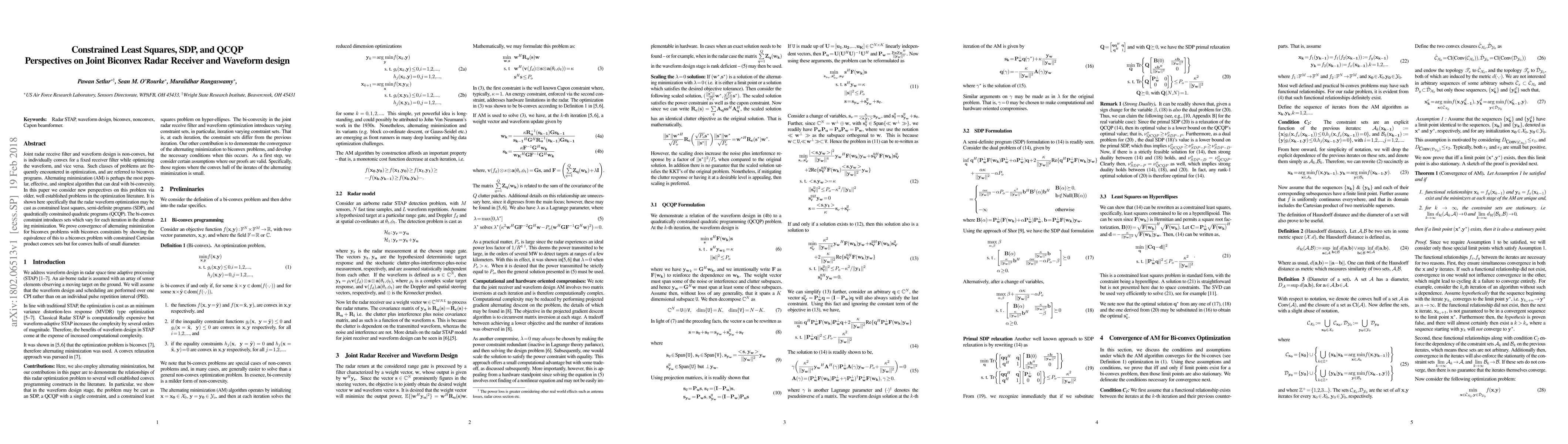 Joint radar receive filter and waveform design is non-convex, but is individually convex for a fixed receiver filter while optimizing the waveform, and vice versa. Such classes of problems are fre- quently encountered in optimization, and are referred to biconvex programs. Alternating minimization (AM) is perhaps the most popu- lar, effective, and simplest algorithm that can deal with bi-convexity. In this paper we consider new perspectives on this problem via older, well established problems in the optimization literature. It is shown here specifically that the radar waveform optimization may be cast as constrained least squares, semi-definite programs (SDP), and quadratically constrained quadratic programs (QCQP). The bi-convex constraint introduces sets which vary for each iteration in the alternat- ing minimization. We prove convergence of alternating minimization for biconvex problems with biconvex constraints by showing the equivalence of this to a biconvex problem with constrained Cartesian product convex sets but for convex hulls of small diameter.