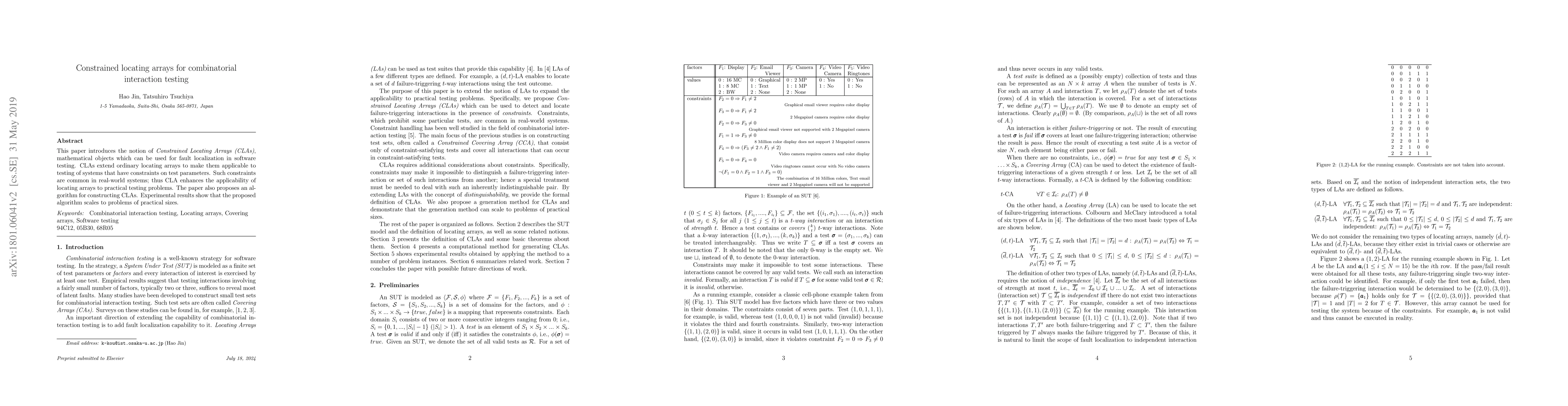 This paper introduces Constrained Locating Arrays (CLAs) for fault localization in software testing, extending traditional locating arrays to accommodate parameter constraints common in real-world systems. An algorithm for constructing CLAs is proposed, and experimental results demonstrate its scalability to practical problem sizes.