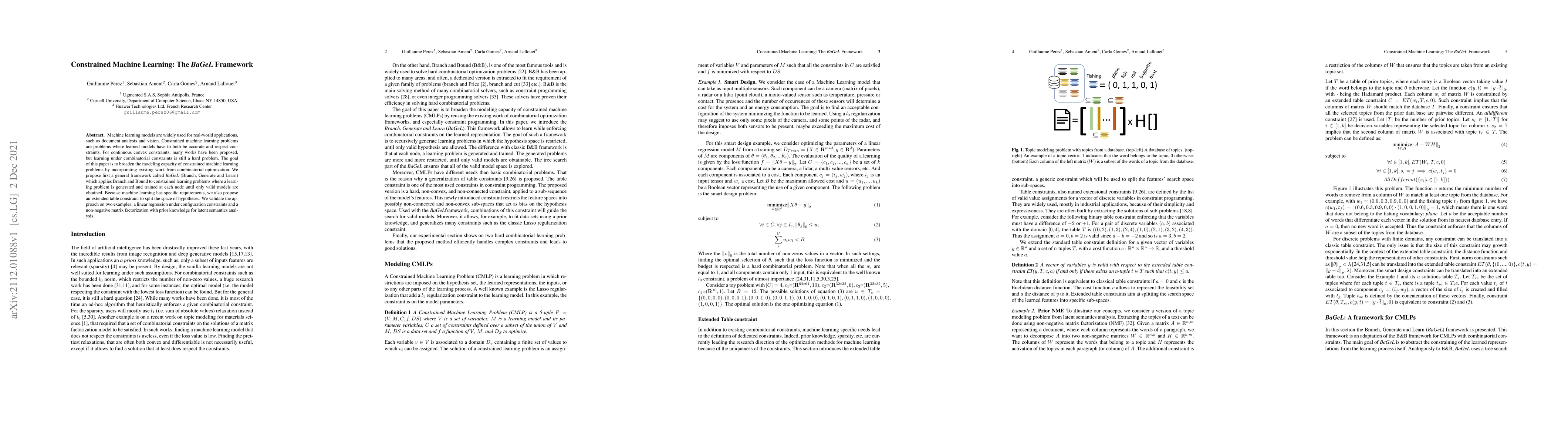 This paper introduces BaGeL, a framework for constrained machine learning that employs Branch and Bound to handle combinatorial constraints. It validates the approach through linear regression and non-negative matrix factorization examples, demonstrating its effectiveness in incorporating combinatorial optimization into learning models.
