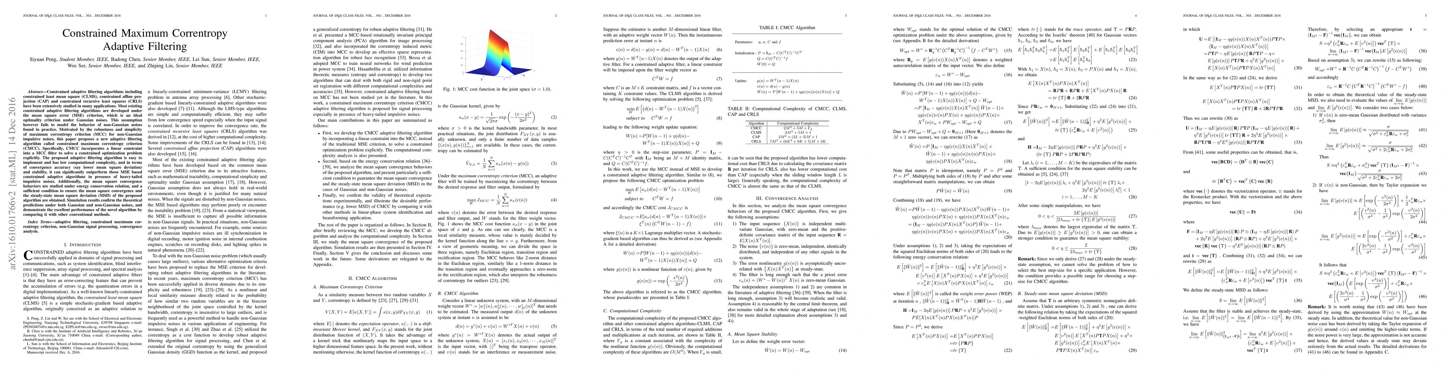 This paper proposes a new constrained maximum correntropy criterion adaptive filtering algorithm (CMCC) that outperforms existing mean square error-based methods in the presence of non-Gaussian impulsive noise. The CMCC algorithm is computationally efficient and demonstrates superior convergence accuracy and stability.