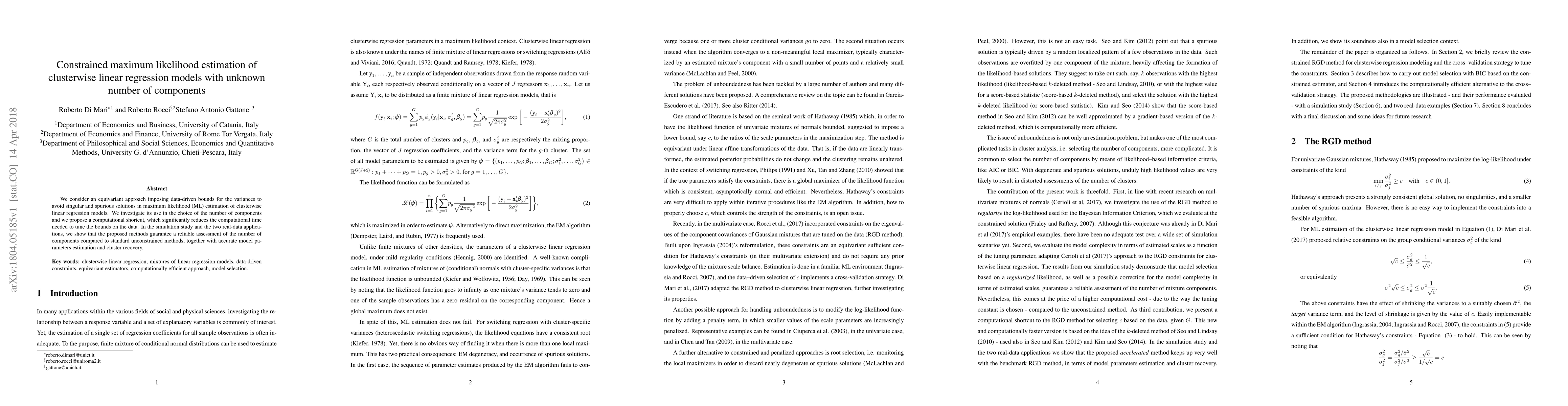 This paper proposes an equivariant approach to constrain maximum likelihood estimation in clusterwise linear regression models, using data-driven variance bounds to avoid singular solutions. It introduces a computational shortcut to efficiently determine the number of components, demonstrating reliable component assessment and accurate parameter estimation in simulations and real-data applications.