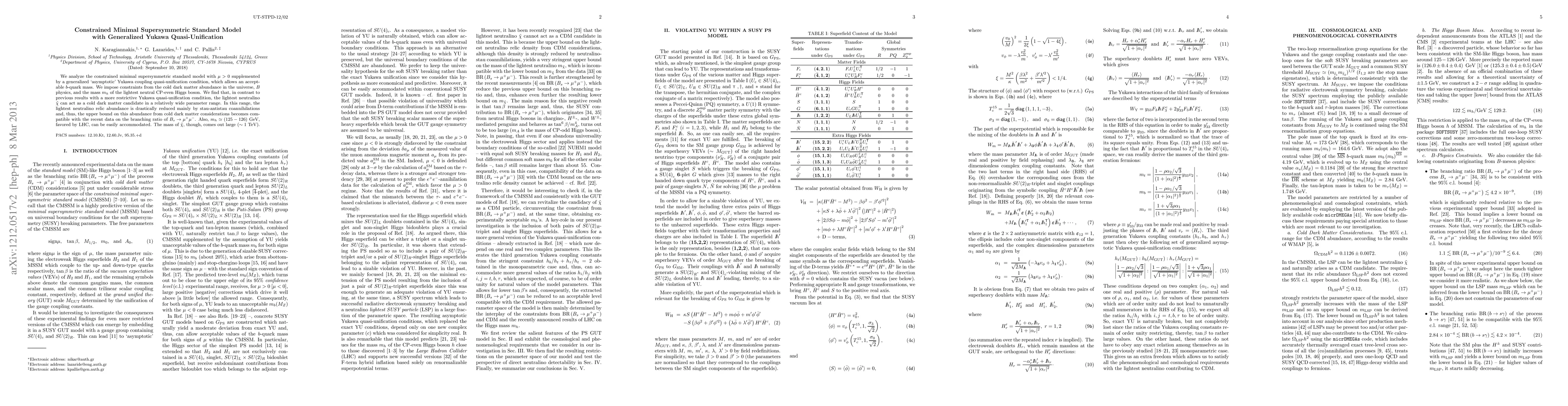 We analyze the constrained minimal supersymmetric standard model with mu>0 supplemented by a generalized `asymptotic' Yukawa coupling quasi-unification condition, which allows an acceptable b-quark mass. We impose constraints from the cold dark matter abundance in the universe, B physics, and the mass of the lightest neutral CP-even Higgs boson. We find that, in contrast to previous results obtained for a more restrictive Yukawa quasi-unification condition, the lightest neutralino can act as a cold dark matter candidate in a relatively wide parameter range. In this range, the lightest neutralino relic abundance is drastically reduced mainly by stau-antistau coannihilations and, thus, the upper bound on this abundance from cold dark matter considerations becomes compatible with the recent data on the branching ratio of B_s --> mu^+mu^-. Also, masses for the lightest neutral CP-even Higgs boson about (125-126) GeV, favored by LHC, can be easily accommodated. The mass of the lightest neutralino, though, comes out large (~1 TeV).