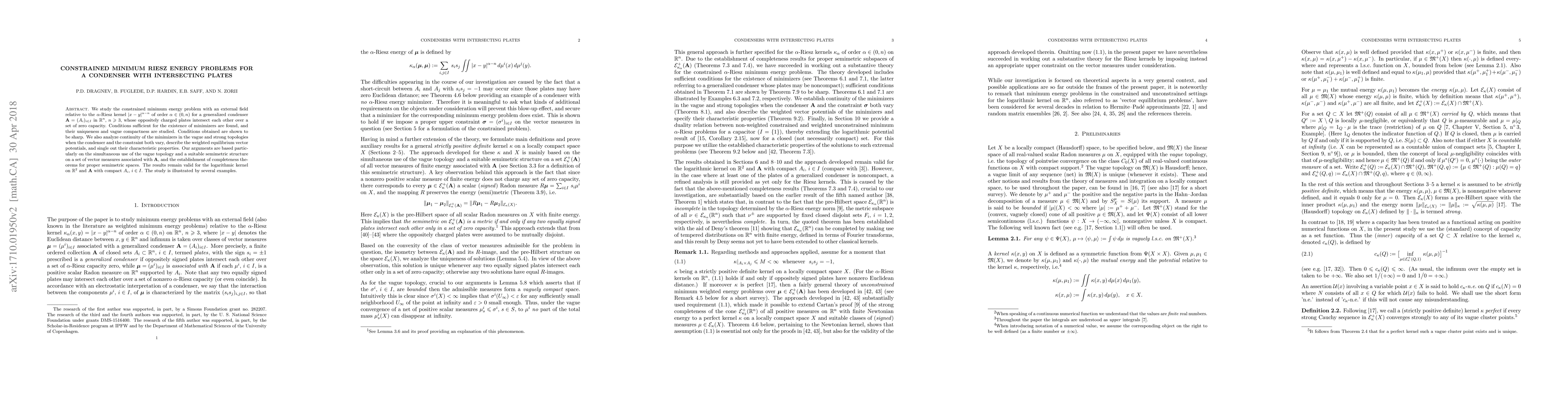 We study the constrained minimum energy problem with an external field relative to the $\alpha$-Riesz kernel $|x-y|^{\alpha-n}$ of order $\alpha\in(0,n)$ for a generalized condenser $\mathbf A=(A_i)_{i\in I}$ in $\mathbb R^n$, $n\geqslant 3$, whose oppositely charged plates intersect each other over a set of zero capacity. Conditions sufficient for the existence of minimizers are found, and their uniqueness and vague compactness are studied. Conditions obtained are shown to be sharp. We also analyze continuity of the minimizers in the vague and strong topologies when the condenser and the constraint both vary, describe the weighted equilibrium vector potentials, and single out their characteristic properties. Our arguments are based particularly on the simultaneous use of the vague topology and a suitable semimetric structure on a set of vector measures associated with $\mathbf A$, and the establishment of completeness theorems for proper semimetric spaces. The results remain valid for the logarithmic kernel on $\mathbb R^2$ and $\mathbf A$ with compact $A_i$, $i\in I$. The study is illustrated by several examples.