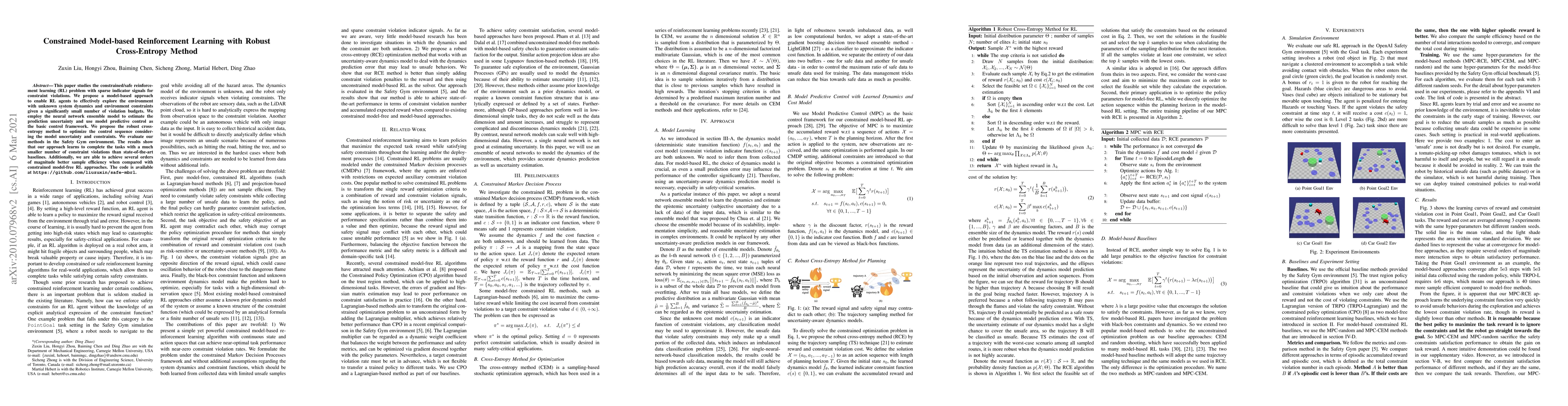 This paper proposes a model-based approach to constrained reinforcement learning that learns to navigate environments with unknown dynamics and constraints using a neural network ensemble and robust cross-entropy method, achieving better sample efficiency than state-of-the-art methods.