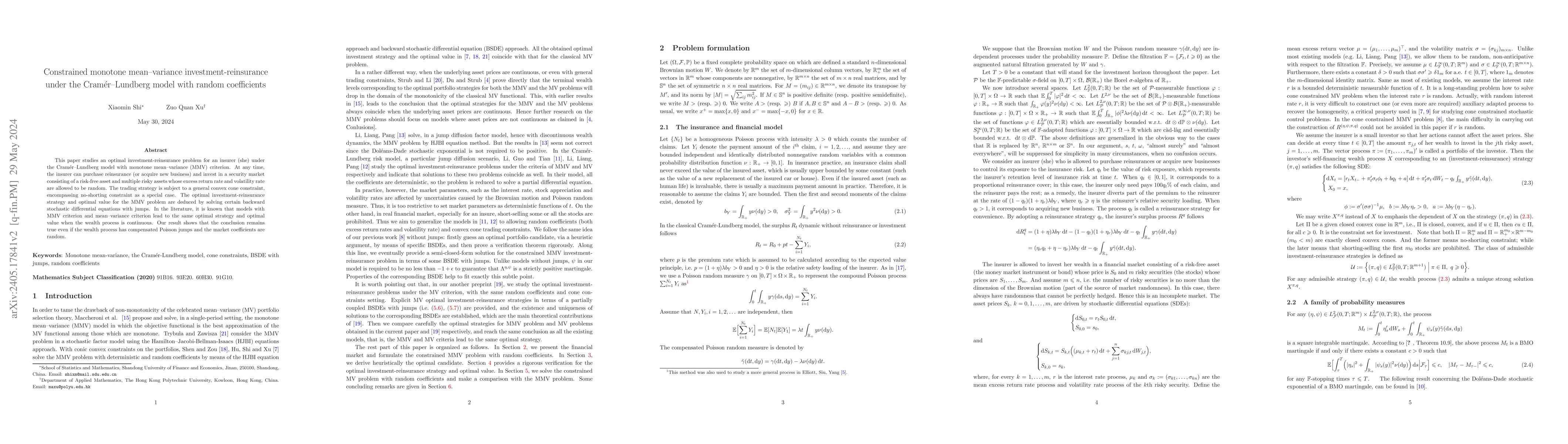 This paper derives optimal investment-reinsurance strategies for insurers under the Cramér-Lundberg model, considering random market coefficients and monotone mean-variance criteria, using solutions to backward stochastic differential equations with jumps. The optimal strategy remains consistent with continuous wealth processes despite jumps and randomness.