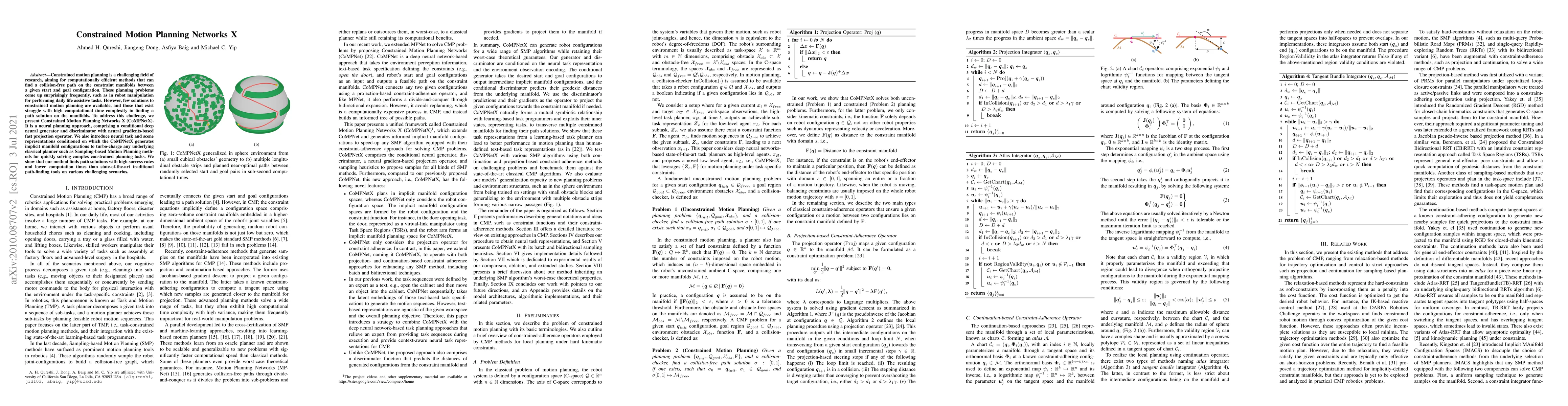 Constrained Motion Planning Networks X (CoMPNetX) introduces a neural planning approach that combines a conditional deep neural generator and discriminator with a fast projection operator to efficiently find collision-free paths on constraint manifolds. This method significantly outperforms traditional planners in both success rates and computation times for complex constrained motion planning tasks.