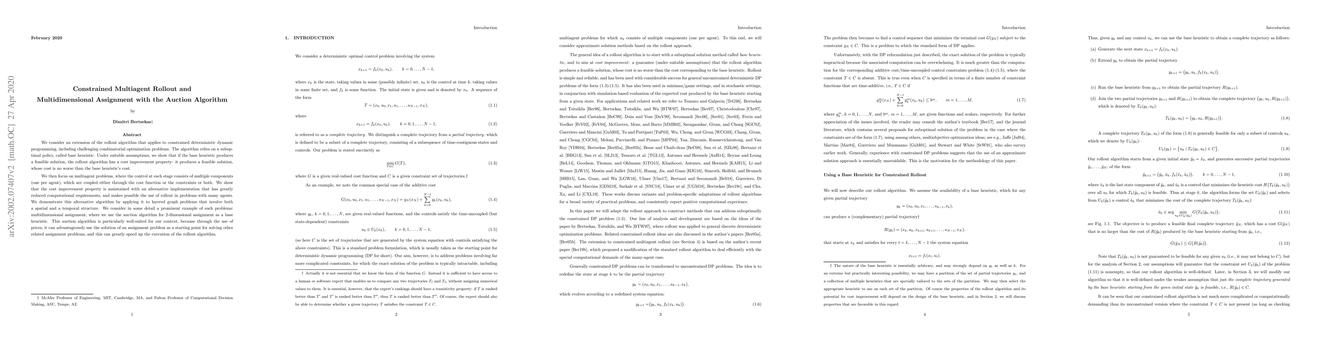 This paper extends the rollout algorithm for constrained deterministic dynamic programming, demonstrating its cost improvement property. It applies this enhanced algorithm to multiagent problems, significantly reducing computational demands, and showcases its effectiveness in multidimensional assignment problems using the auction algorithm as a base heuristic.