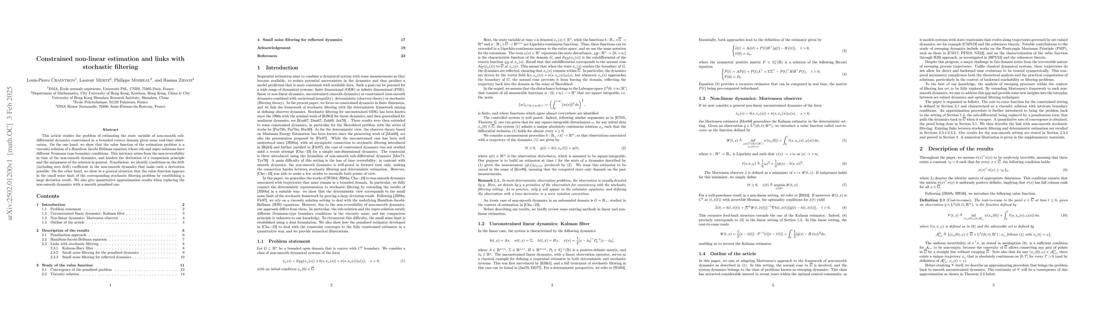 The paper establishes links between constrained non-linear estimation and stochastic filtering, providing conditions for value function uniqueness and demonstrating its appearance in small noise limits.