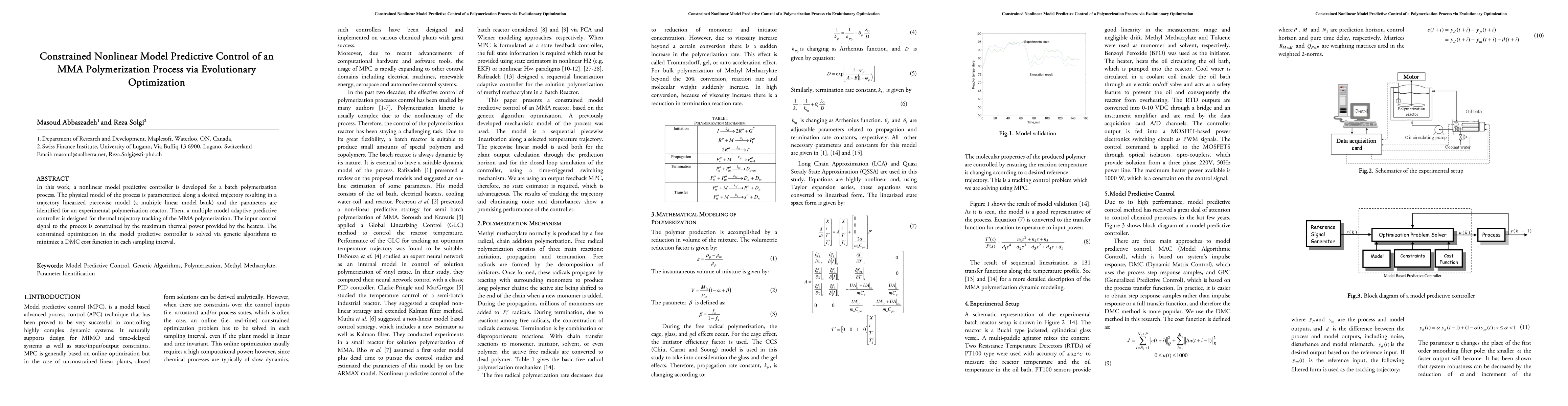 This paper develops a nonlinear model predictive controller for an MMA polymerization process, utilizing a linearized piecewise model and evolutionary optimization. The controller tracks thermal trajectories while respecting input constraints, employing genetic algorithms to optimize control signals.